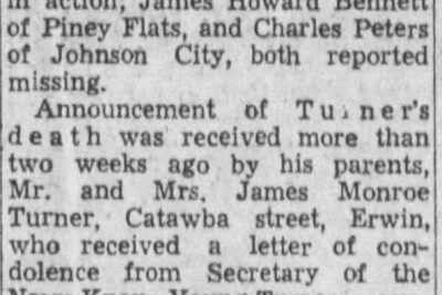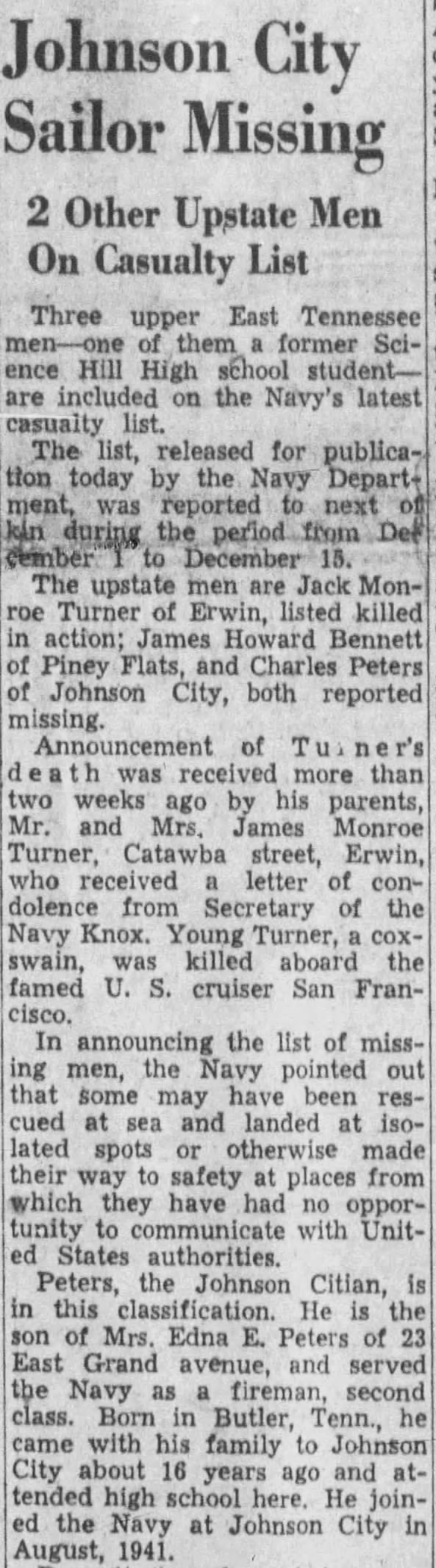 Three upper East Tennessee men are included on the Navy’s latest casualty list. The list, released for publication today by the Navy Department, was reported to next of kin during the period from December 1 to December 15. The upstate men are Jack Monroe Turner of Erwin, listed killed in action; James Howard Bennett of Piney Flats and Charles Peters of Johnson City, both reported missing.