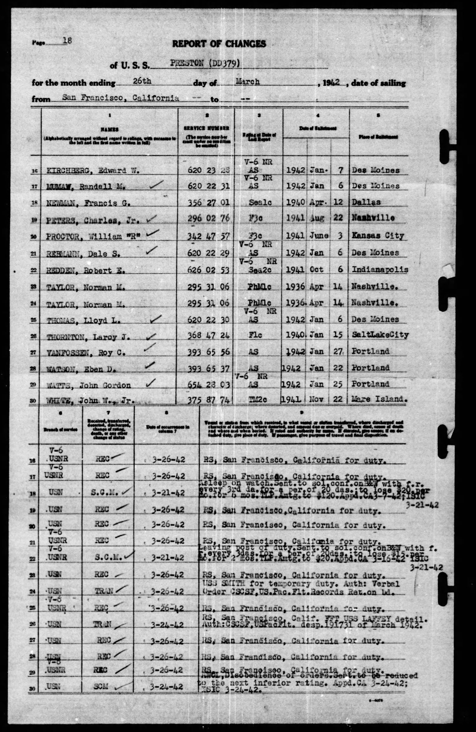 At 0036 November 15, 1942 the U.S.S. Preston was sunk while actively engaged in surface battle against Japanese naval forces. The engagement took place in the channel between Savo Island and Cape Esperance, Guadalcanal Island, Solomon Islands. Task Force Sixty-Four was formed in battle disposition in column in the following order. U.S.S. Walke, U.S.S. Benham, U.S.S. Preston, U.S.S. Gwin, U.S.S. Washington and U.S.S. South Dakota.