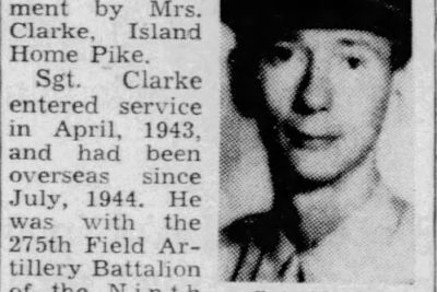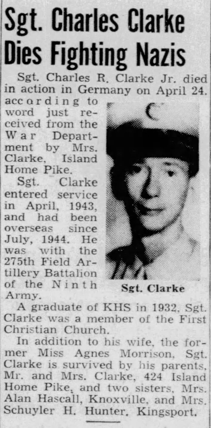 Sgt. Charles R. Clark Jr., husband of Mrs. Agnes Morrison Clark of 42 Island Home Pike, died in Germany April 24, his wife has been informed. Sergeant Clark entered service in April, 1943 and had been overseas since July, 1944, with a field artillery battalion of the Ninth Army. He was graduated from Knoxville High School in 1932, and was a member of the First Christian Church of Knoxville.