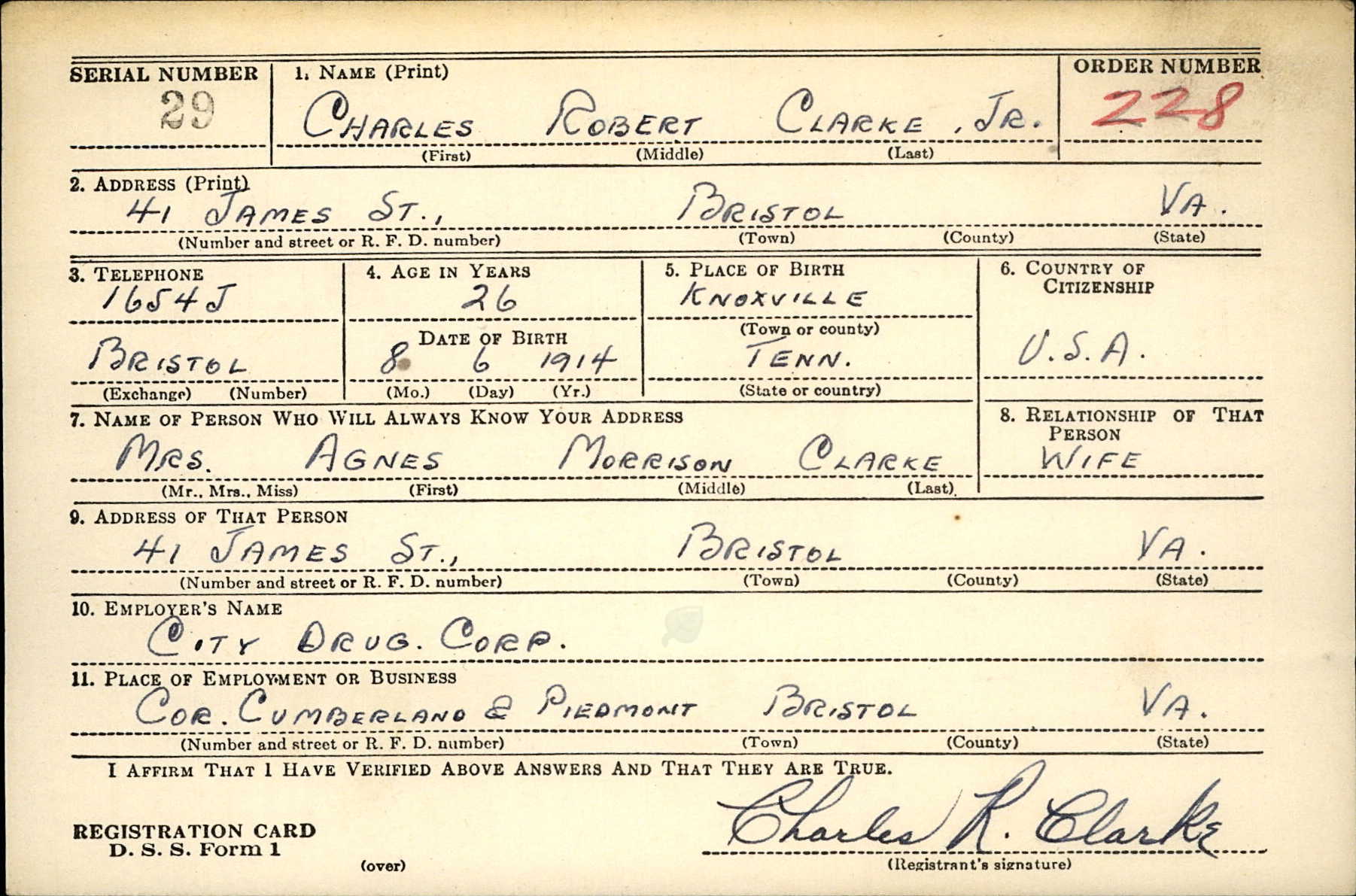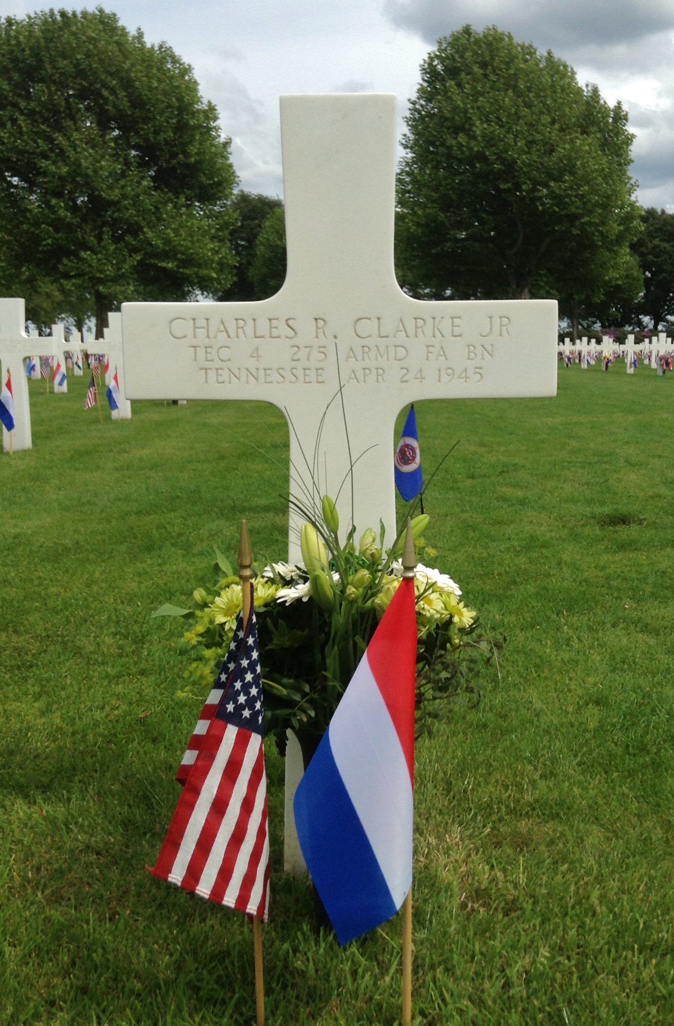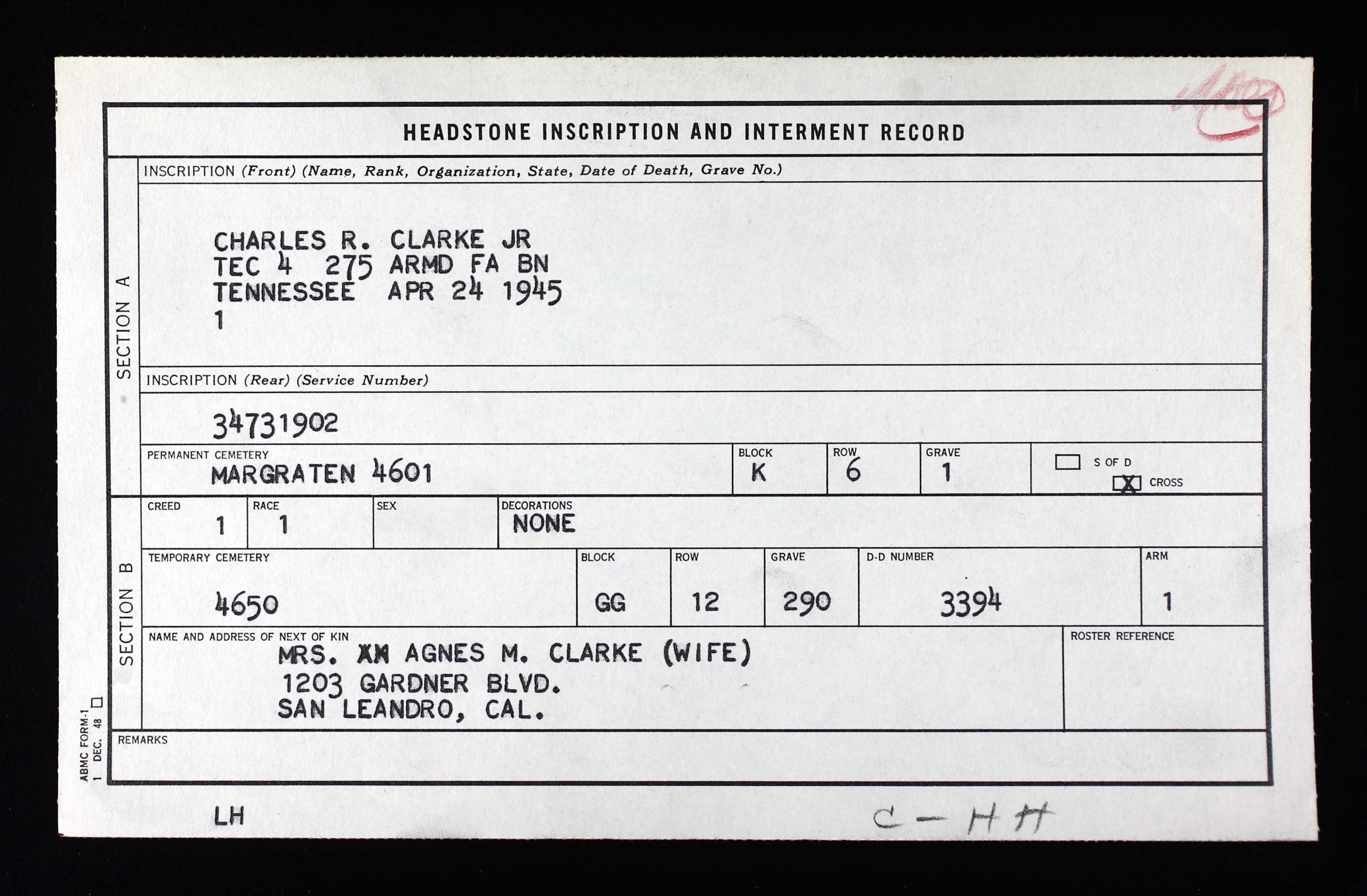 Charles Robert Clarke was born on August 6, 1914, the son of Charles Robert Clarke Sr. and Mayme L. Bruce. According to his enlistment record, his civilian occupation was working as a hotel clerk. He enlisted in the military on April 29, 1943, in Fort Oglethorpe, Georgia. He died non battle.