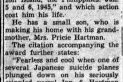 The award was made for Hartman’s “conspicuous gallantry and intrepidity as a 40-mm, Quadruple Gun Mount Director Operator while serving aboard a U. S. Naval vessel, when that ship was subjected to continuous enemy, aerial bombardment off Luzon Island, the Philippines, January 5 and 6, 1945, and which action cost him his life.
