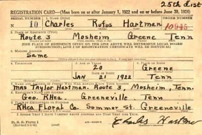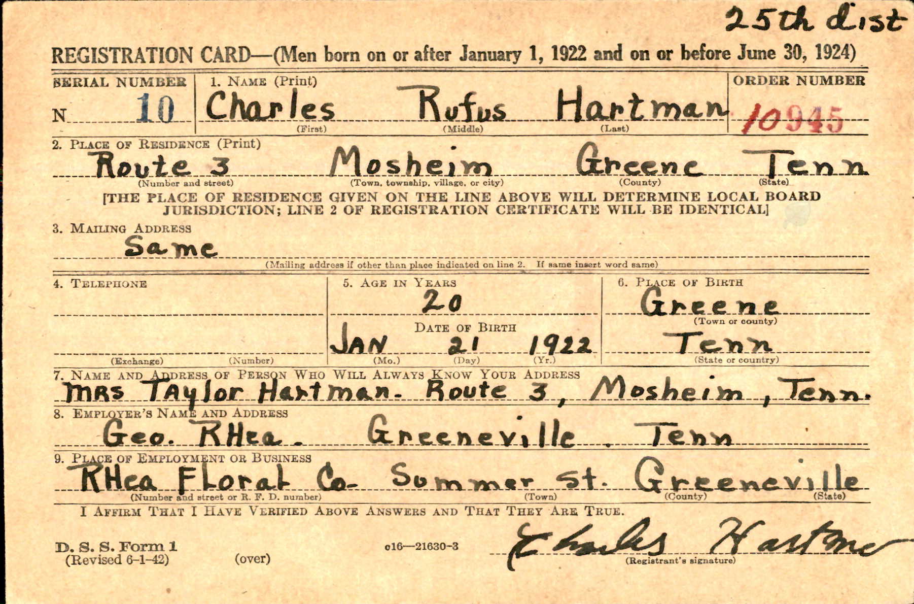 Charles Rufus Hartman was the son of James Taylor Hartman and Della Pricie Tomlinson. Husband of Martha Nadine Ball and father of a son.