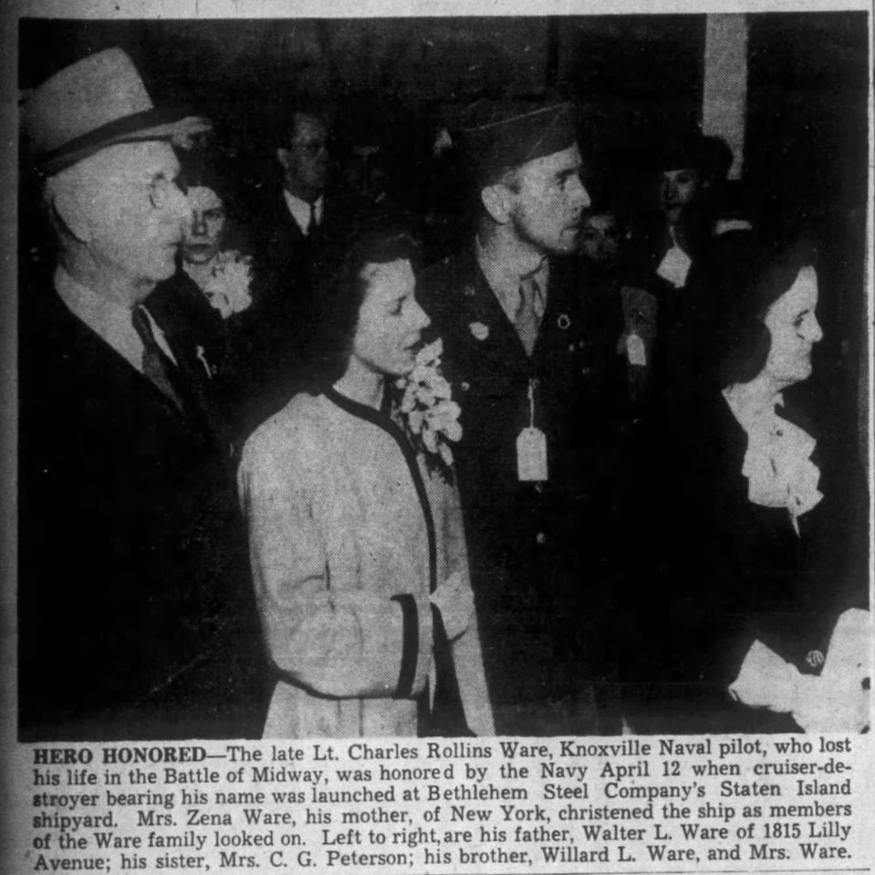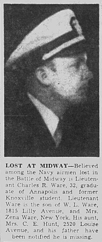 Lost at Midway – Believed among the Navy airmen lost in the Battle of Midway is Lieutenant Charles R. Ware, 32, graduate of Annapolis and former Knoxville student. Lieutenant Ware is the son of W.L. Ware, 1815 Lilly Avenue, and Mrs. Zena Ware, New York. His aunt, Mrs. C.E. Hunt, 520 Louise Avenue, and his father have been notified he is missing.
