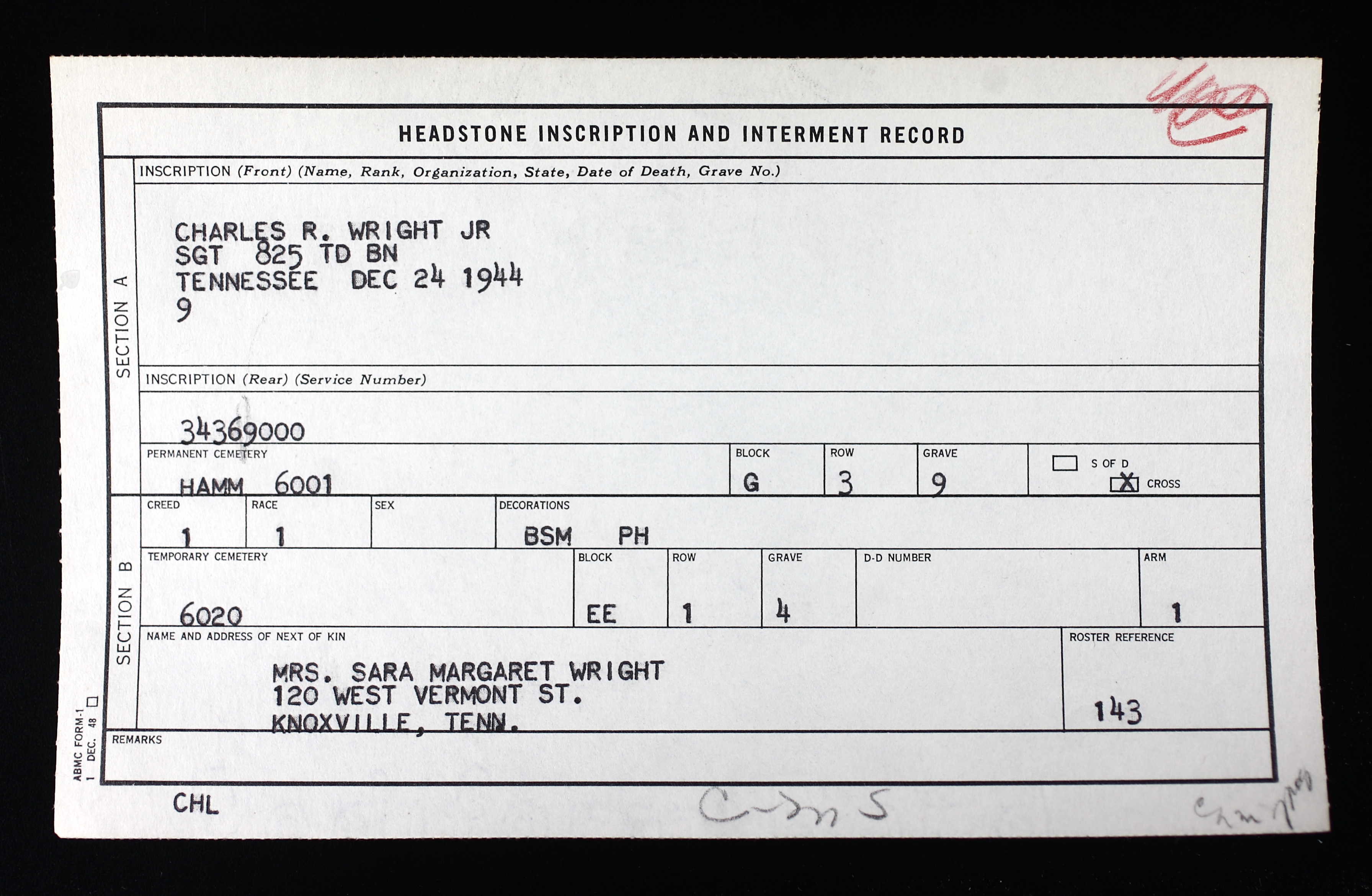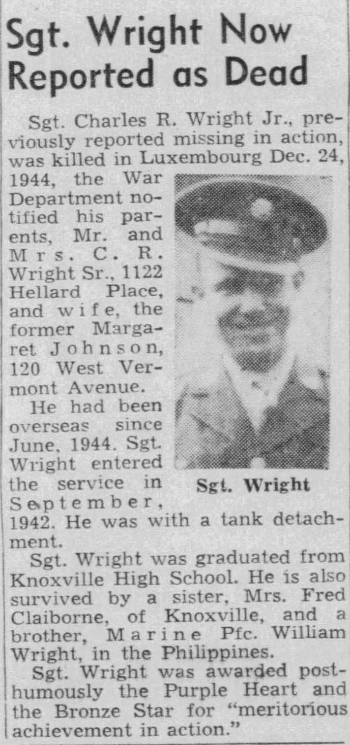Sgt. Charles R. Wright Jr., previously reported missing in action, was killed in Luxembourg Dec. 24, 1944, the War Department notified his parents, Mr. and Mrs. C.R. Wright Sr., 1122 Hellard Place and wife, the former Margaret Johnson, 120 West Vermont Avenue. He had been overseas since June, 1944. Sgt. Wright entered the service in September, 1942. E was with a tank detachment. Sgt. Wright was graduated from Knoxville High School. He is also survived by a sister, Mrs. Fred Claiborne, of Knoxville, and a brother, Marine Pfc. William Wright in the Philippines. Sgt. Wright was awarded posthumously the Purple Heart and the Bronze Star for meritorious achivement in action.