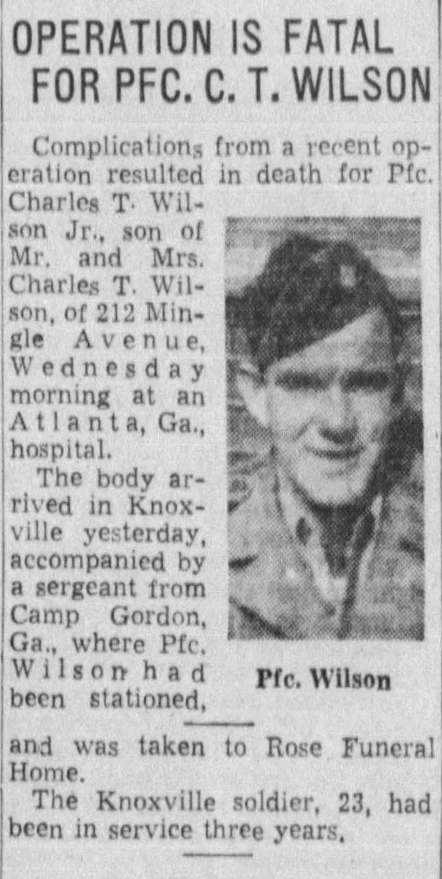 Charles Thomas Wilson was born on 25 September 1919, the son of Charles Thomas Wilson and Mary K. Courtney. Siblings: Charles T. Wilson, Harry N. Wilson, Bobbie R. Wilson, Peggie L. Wilson, and Katherine Wilson. He enlisted on September 16, 1940, in Knoxville.