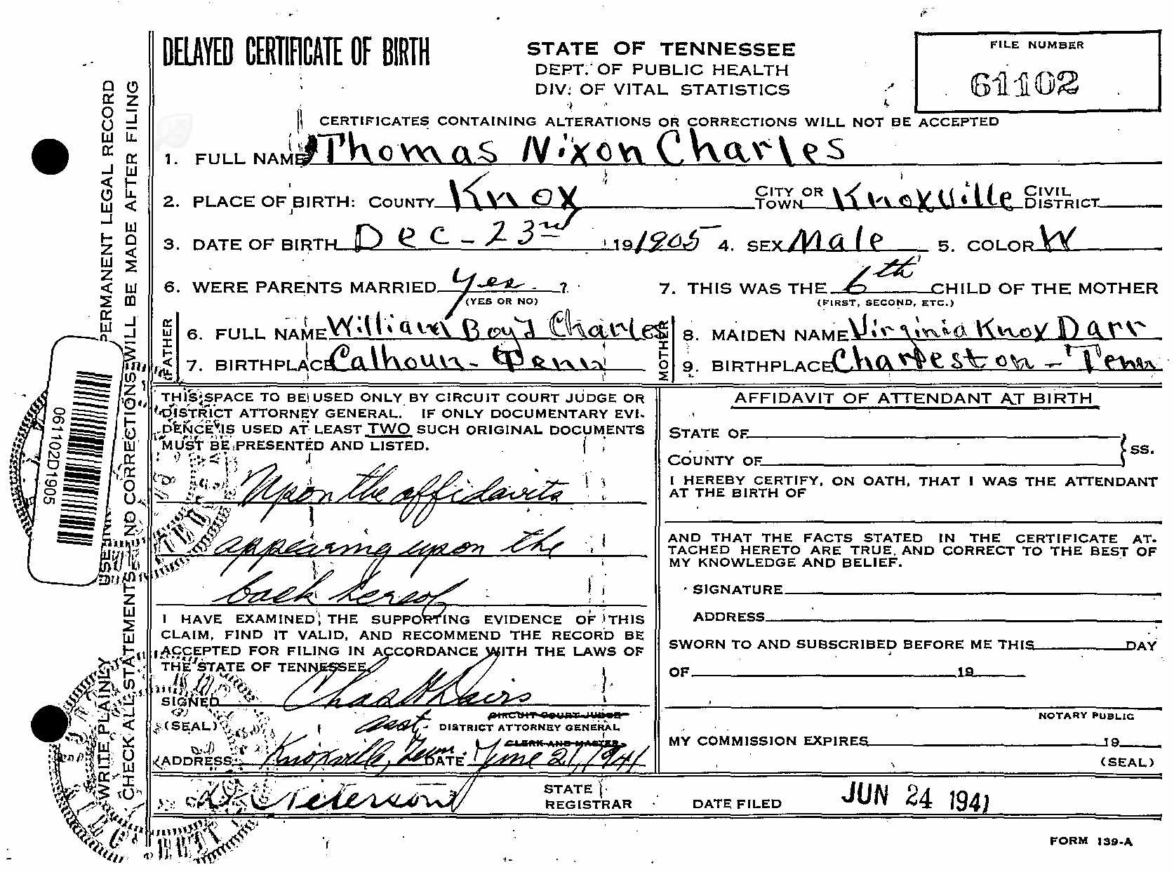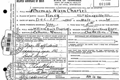 Thomas Nixon Charles was born in McMinn County but lived most of his life in Knox County. He was the son of William Boyd Charles and Virginia Knox Darr. He married Lila Tew Witsell on October 4, 1934, in Shelby, Tennessee. He was graduated from the University of Tennessee in 1929.