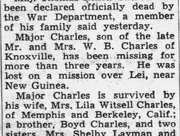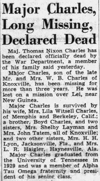 Maj. Thomas Nixon Charles has been declared officially dead by the War Department, a member of his family said yesterday. Major Charles, son of the late Mr. and Mrs. W.B. Charles of Knoxville, has been missing for more than three years. He was lost on a mission over Lei, near New Guinea. Major Charles is survived by his wife, Mrs. Lila Witsell Charles, of Memphis and Berkeley, Calif.; a brother, Boyd Charles, and two sisters, Mrs. Shelby Layman and Mrs. John Tatem, all of Knoxville; and two other sisters, Mrs. H.H. Lyon, Jacksonville, Fla., and Mrs. L.R. Haigler, Haynesville, Ala. Major Charles graduated from the University of Tennessee in 1929 and was a member of Alpha Tau Omega fraternity and president of his senior class.