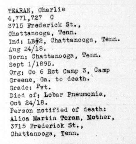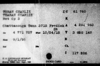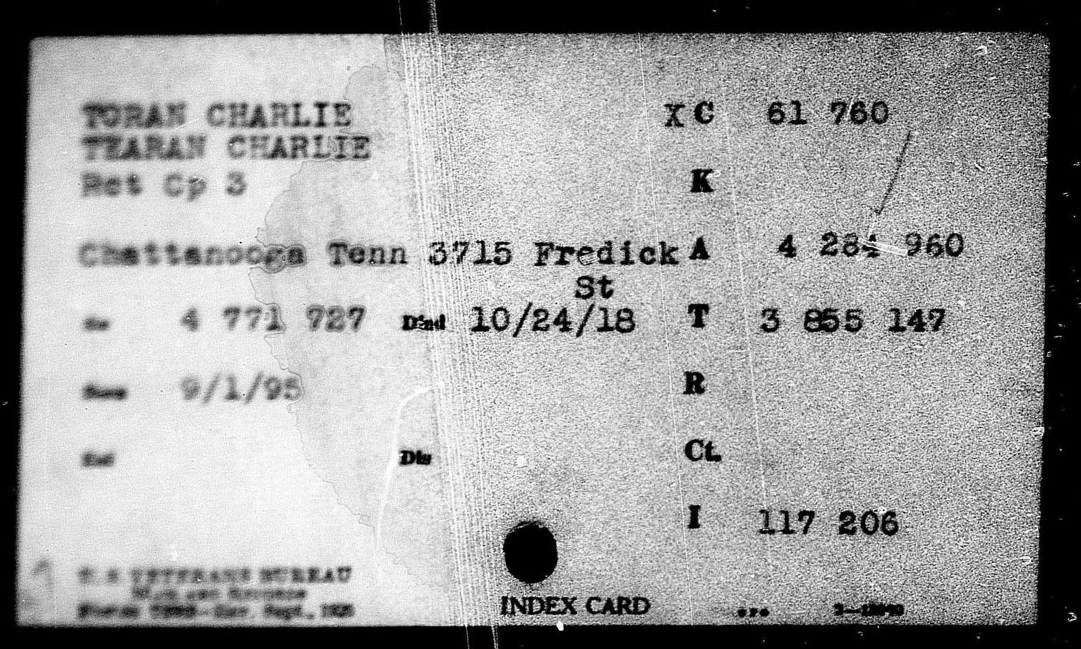 Charles Toran or Charlie Tearan was born September 1895 in Chattanooga, Tennessee to James T. Toran and Alica Martin Caldwell.