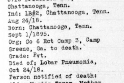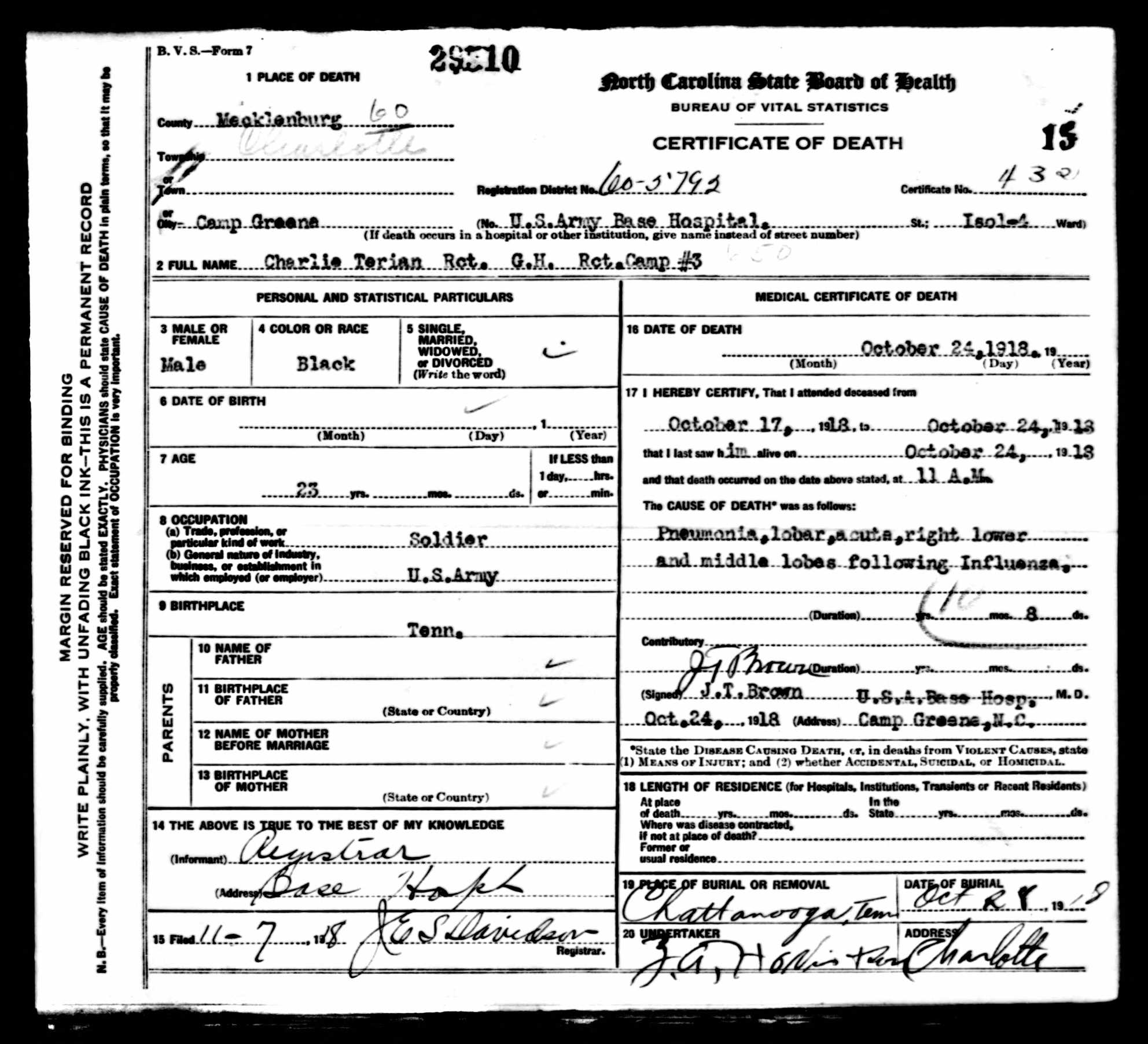 Pvt Toran was admitted at the U.S. Army Base Hospital at Camp Greene, North Carolina on 17 October 1918 and died on 24 October of Pneumonia and influenza at the age of 23.