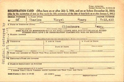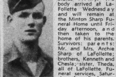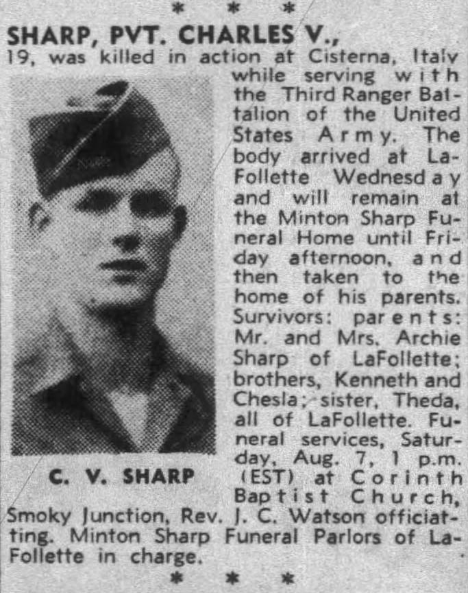 Pvt. Charles V. Sharp, 19, was killed in action at Cisterna, Italy while serving with the Third Ranger Battalion of the United States Army. The boyd arrived at LaFollette and will remain at the Minton Sharp Funeral Home and then taken to the home of his parents. Survivors: parents, Mr. and Mrs. Archie Sharp of LaFollette; brothers, Keith and Chesla; sister, Theda, all of LaFollette.