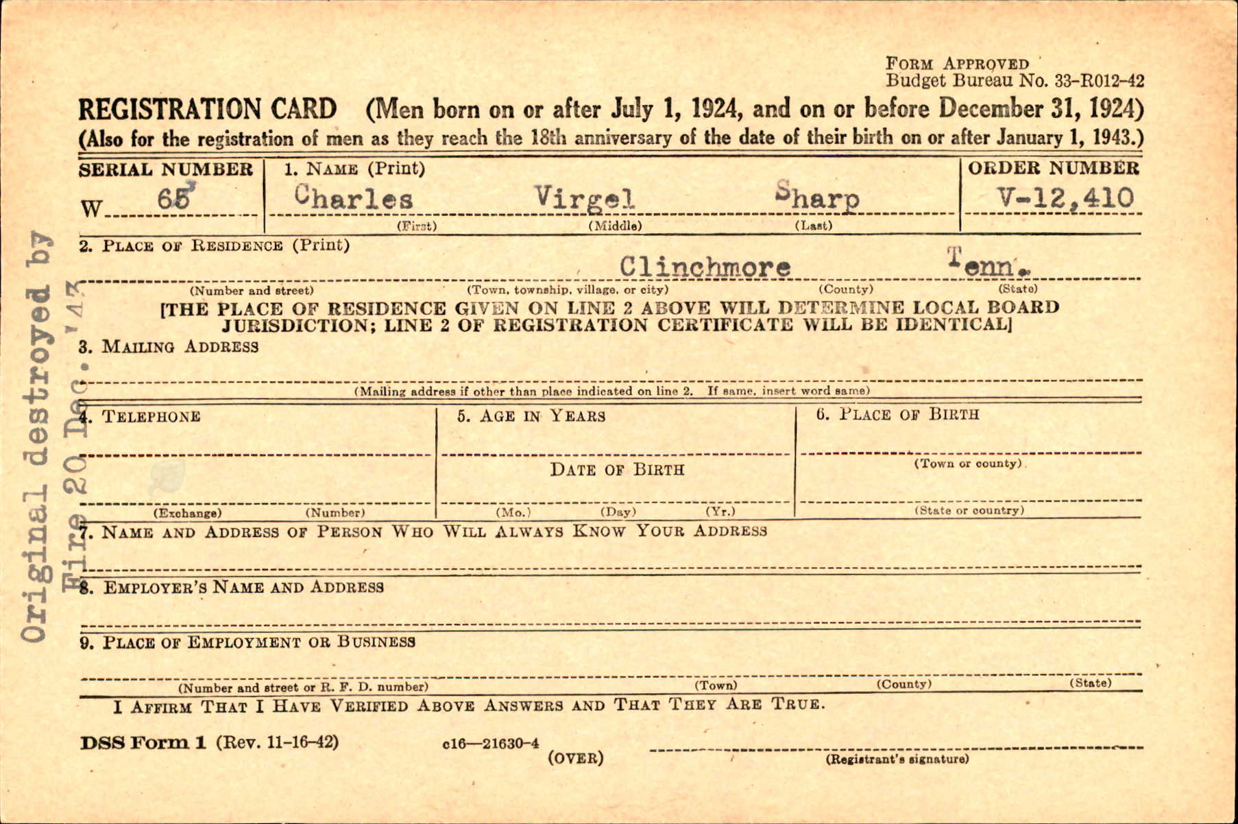Charles Virgil Sharp was born on 23 September 1924, the son of Archie McDonald Sharp and and Helen Lowe.