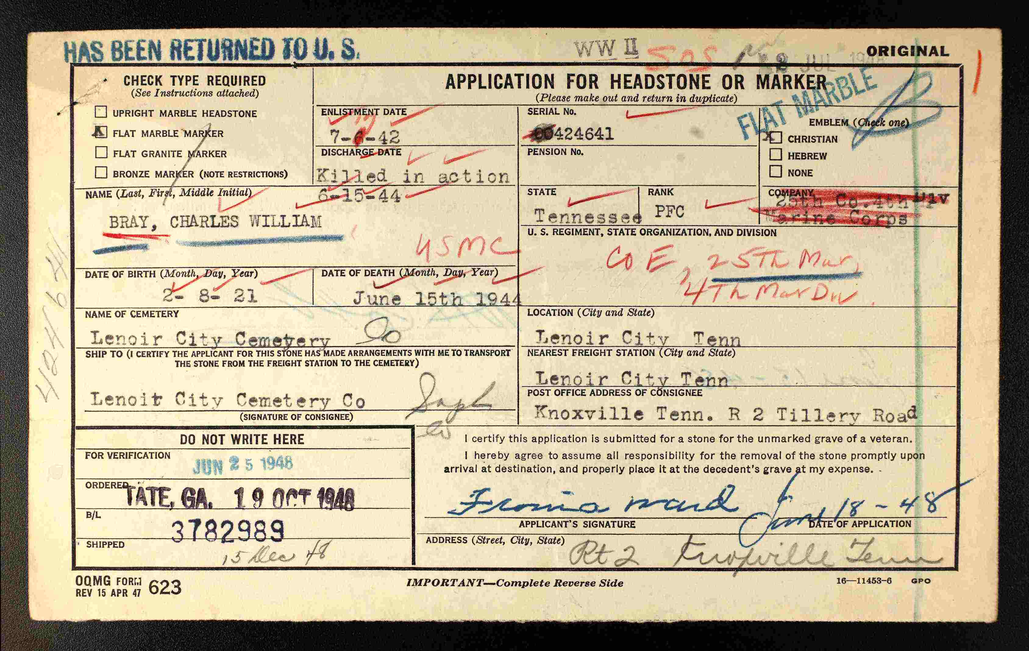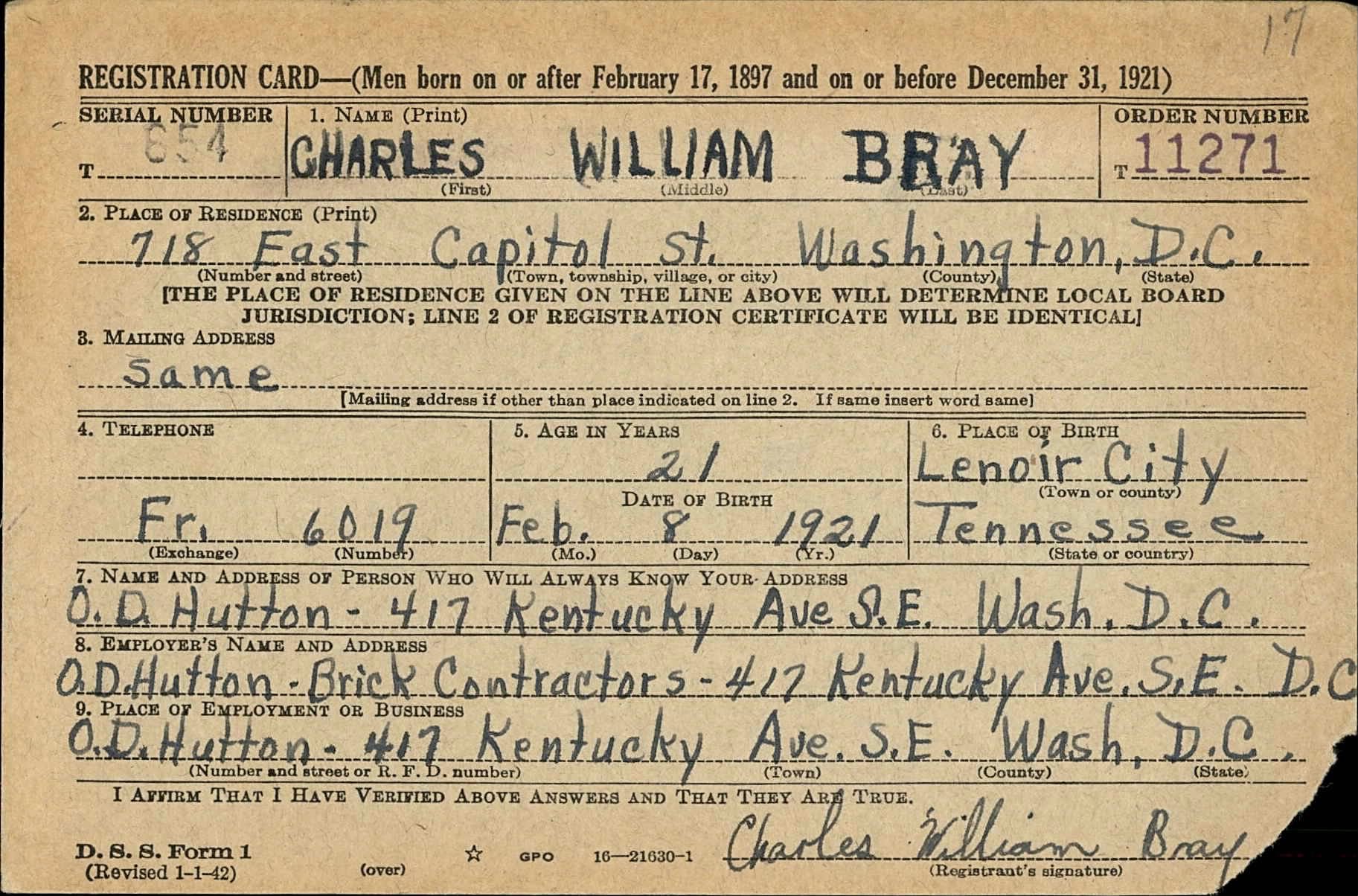 Charles William Bray was born 8 February 1921 in Lenoir City