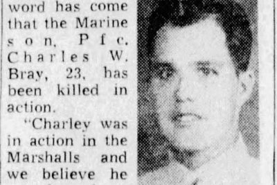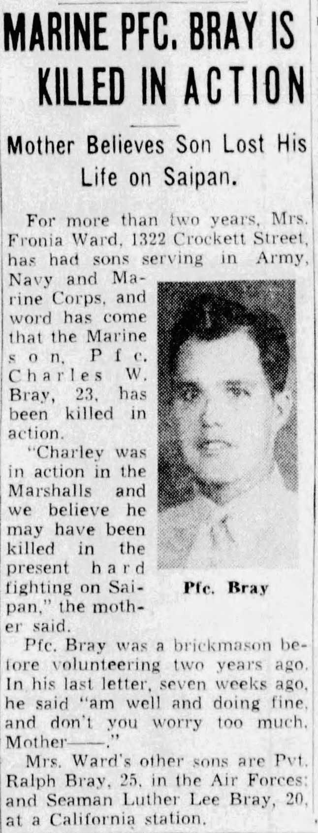 For more than two years, Mrs. Fronia Ward, 1322 Crockett Street, has had sons serving in Army, Navy and Marine Corps, and word has come that Marine son, Pfc. Charles W. Bray, 23, has been killed in action. “Charley was in action in the Marshalls and we believe he may have been killed in the present hard fighting on Saipan,” the mother said.