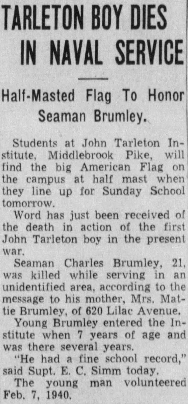 Students of John Tarleton Institute, Middelbrook Pike, will find the big American Flag on the campus at half mast when they line up for Sunday School tomorrow. Word has just been received of the death in action of the first John Tarleton boy in the present war. Seaman Charles Brumley, 21, was killed while serving in an unidentified area, according to the message to his mother, Mrs. Mattie Brumley, of 620 Lilac Avenue. Young Brumley entered the Institute when 7 years of age and was there several years. “He had a fine school record,” said Supt E.C. Simm today. The young man volunteered Feb. 7, 1940.