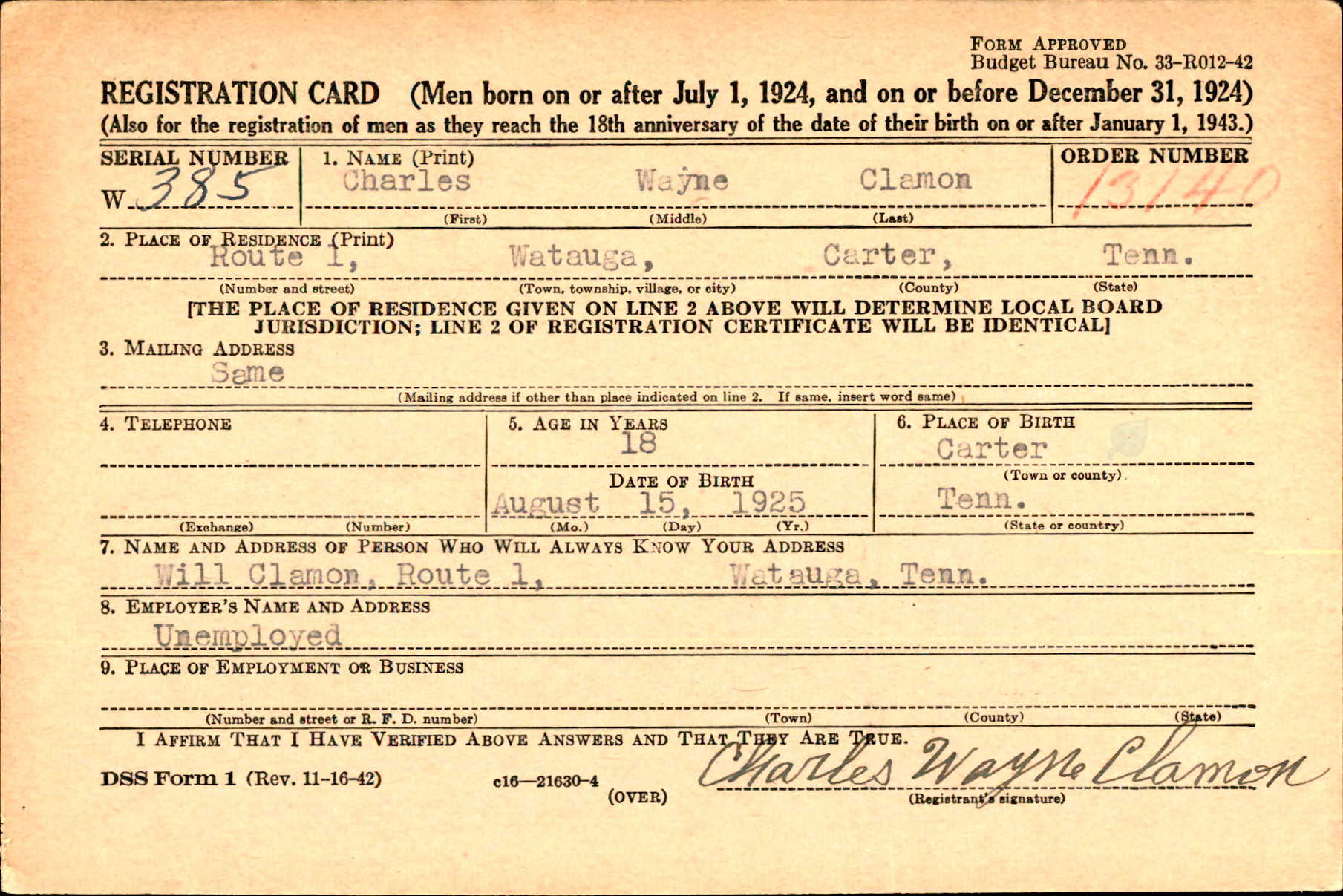 Charles Wayne Clamon was born on 15 August 1925, the son of William A Clamon and Margaret Arney Claman.