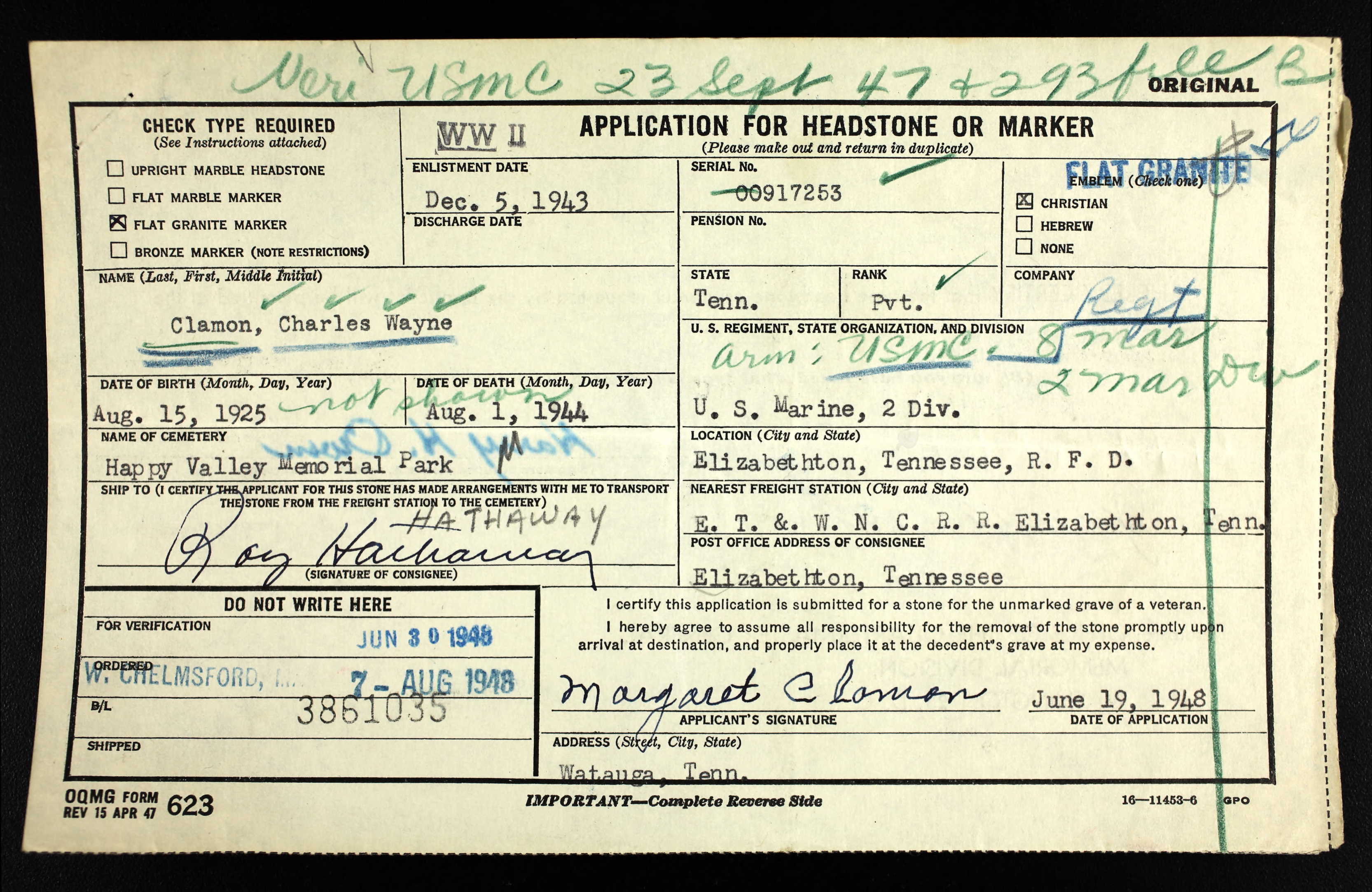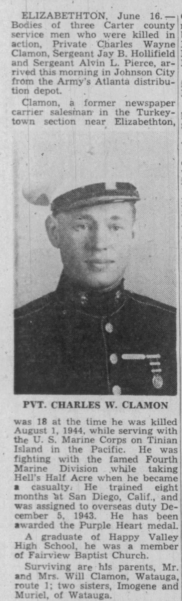 Bodies of three Carter county service men who were killed in action, Private Charles Wayne Clamon, Sergeant Jay B. Hollifield and Sergeant Alvin L. Pierce, arrived this morning in Johnson City from the Army’s Atlanta distribution depot. Clamon, a former newspaper carrier salesman in the Turkeytown section near Elizabethton, was 18 at the time he was killed August 1, 1944, while serving with the U.S. Marine Corps on Tinian Island in the Pacific. He was fighting with the famed Fourth Marine Division while taking Hell’s Half Acre when he became a casualty. He trained eight months at San Diego, Calif., and was assigned to overseas duty December 5, 1943. He has been awarded the Purple Heart medal.
