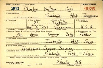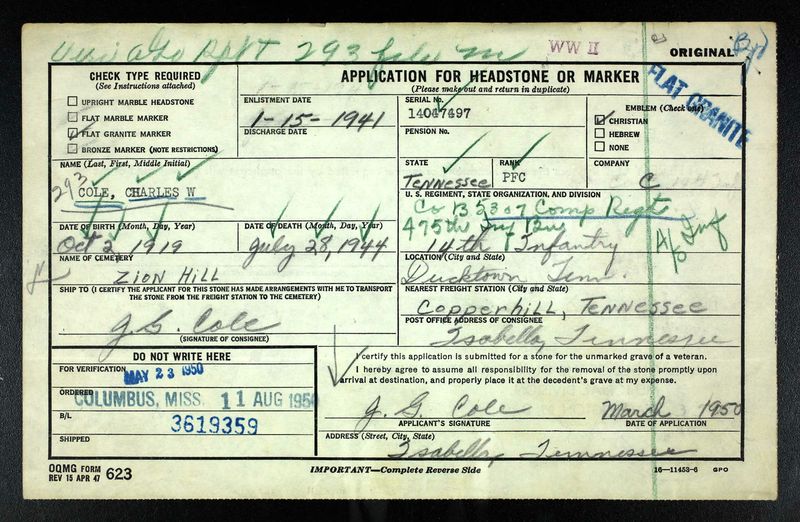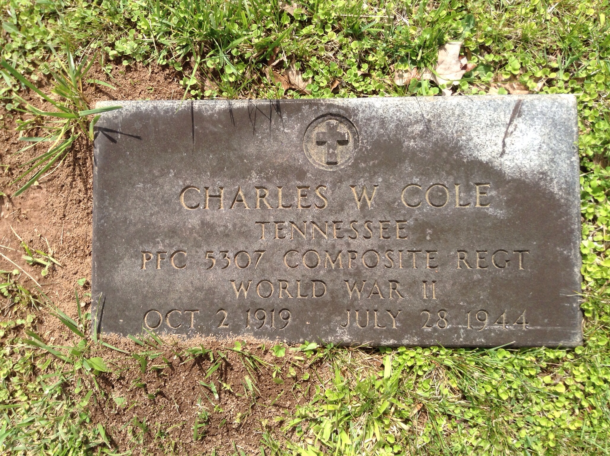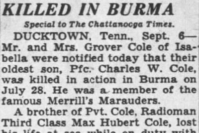 Charles William Cole was the son of Grover John Cole and Sarah Ola Wallace. Max Herbert Cole, brothers, both died during WWII. Charles is buried at the Zion Hill Baptist Church Cemetery at Turtletown, Polk County, TN and next to him is a memorial stone for Max.