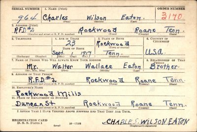 “Pvt. Chas. W. Eaton Killed in Action. Mr. and Mrs. General Eaton of Route Two, received a telegram from the war department last Monday informing them of the fact that their son, Pvt. Charles W. Eaton was killed in action on Aug. 10th. Pvt. Eaton had been in service several years and at the time of his death was stationed in the Mid-Pacific. It was in the battle of Guam when he was huen [sic] down by the enemy.”