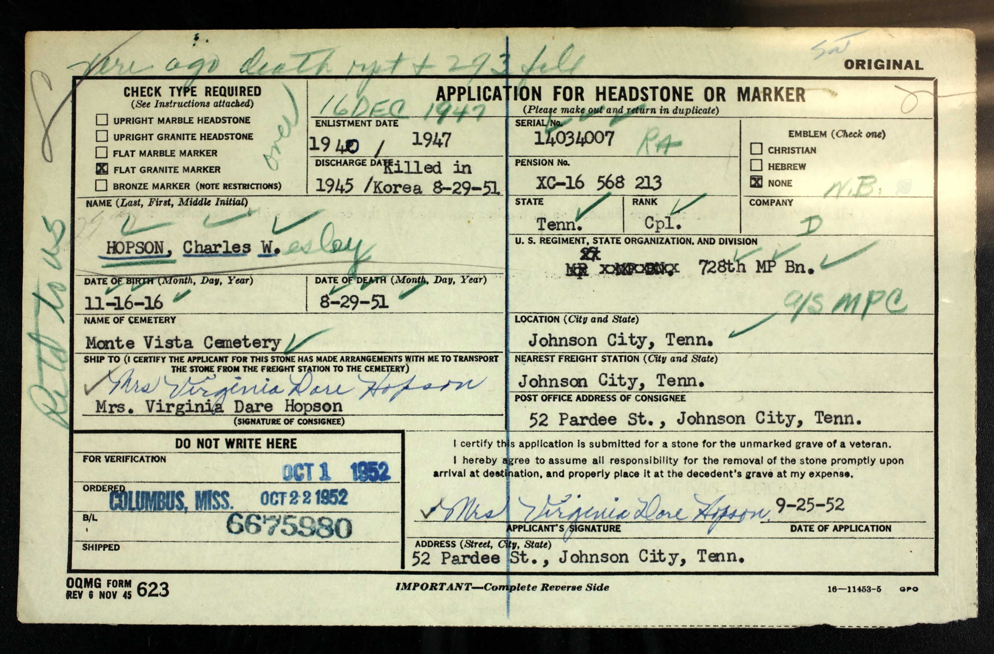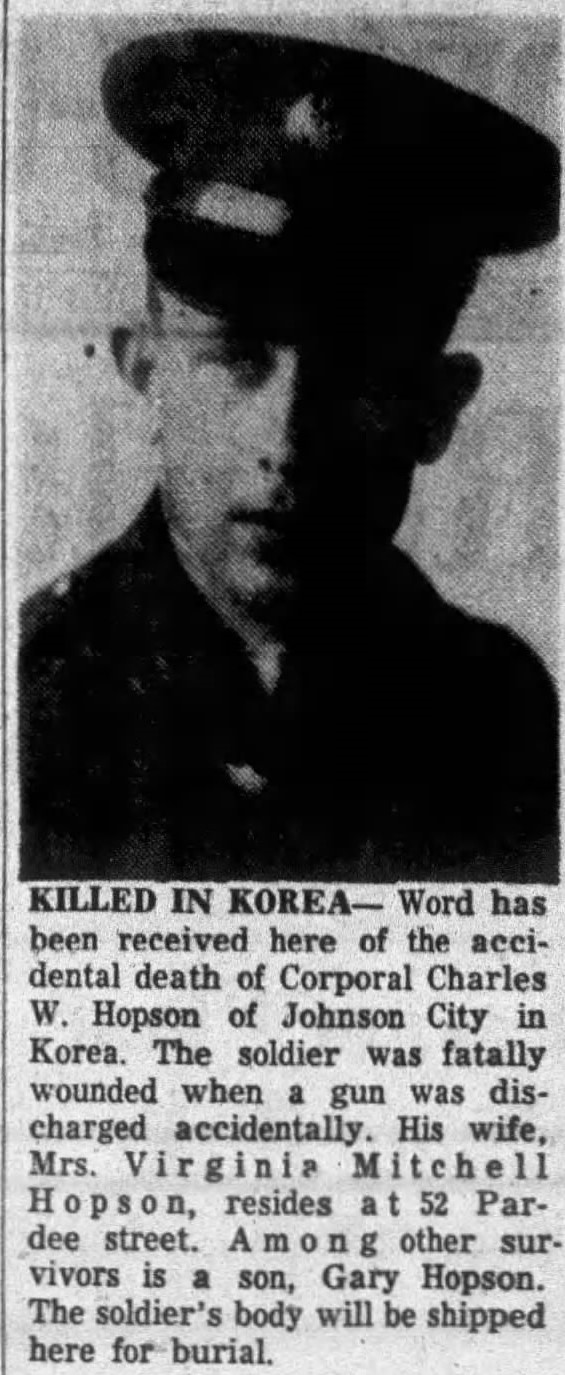 Word has been received here of the accidental death of Corporal Charles W. Hopson of Johnson City in Korea. The soldier was fatally wounded when a gun was discharged accidentally. His wife, Mrs. Virginia Mitchell Hopson, resides at 52 Pardee street. Among other survivors is a son, Gary Hopson. The soldier’s body will be shipped here for burial.