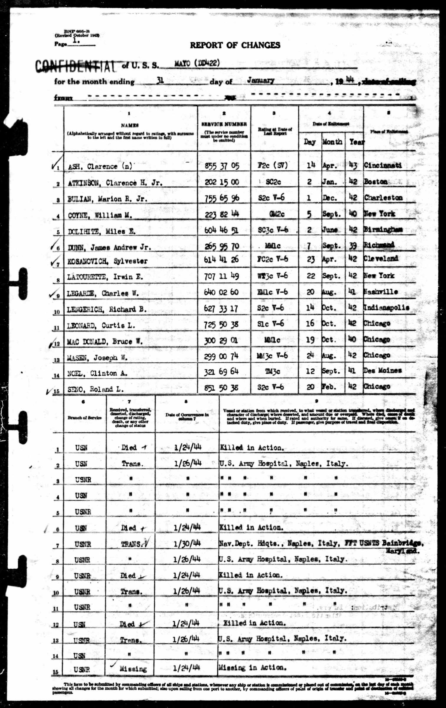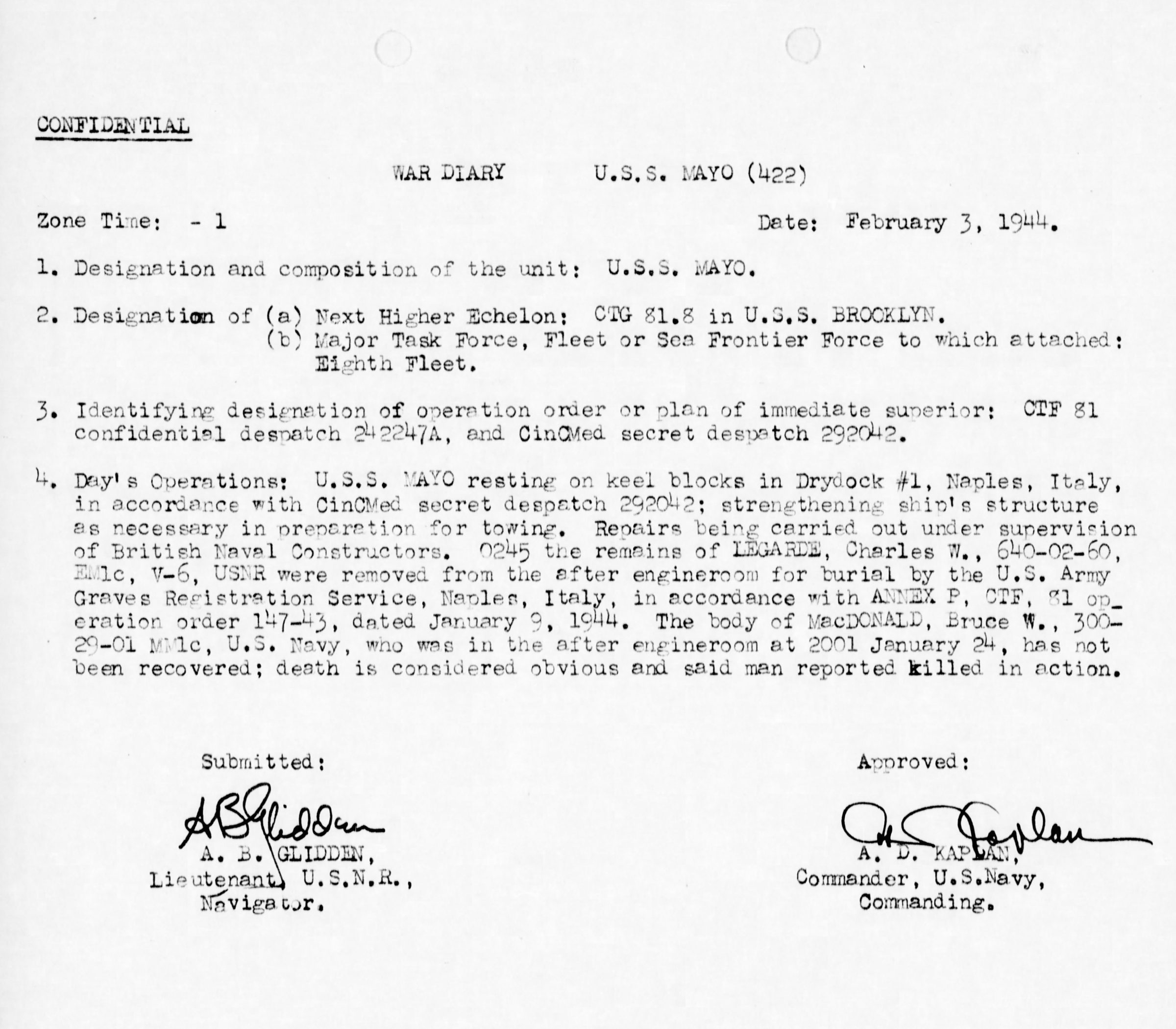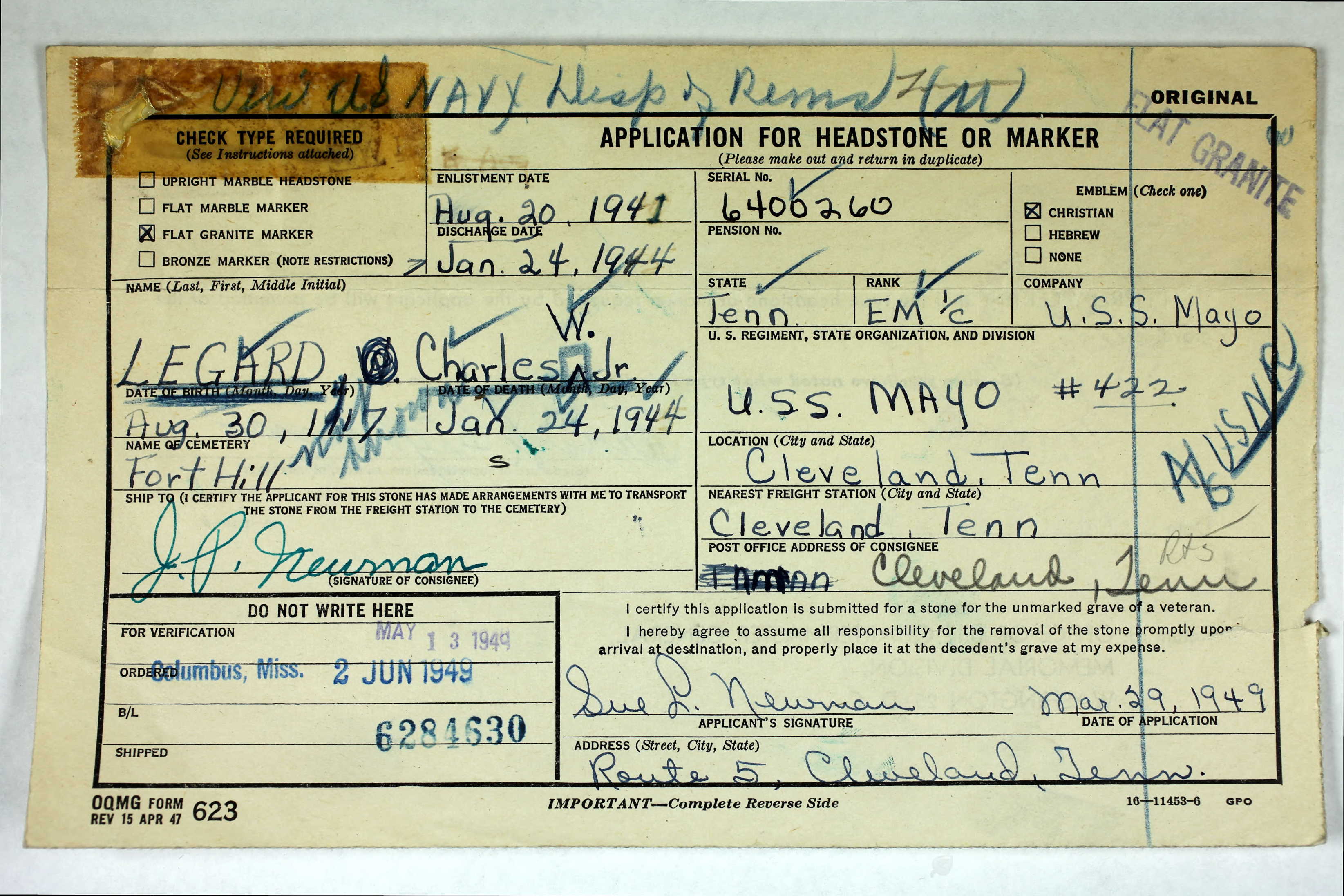 Electricians Mate First Class Charles W. Legarde was stationed on the USS Mayo during his service in World War II.
