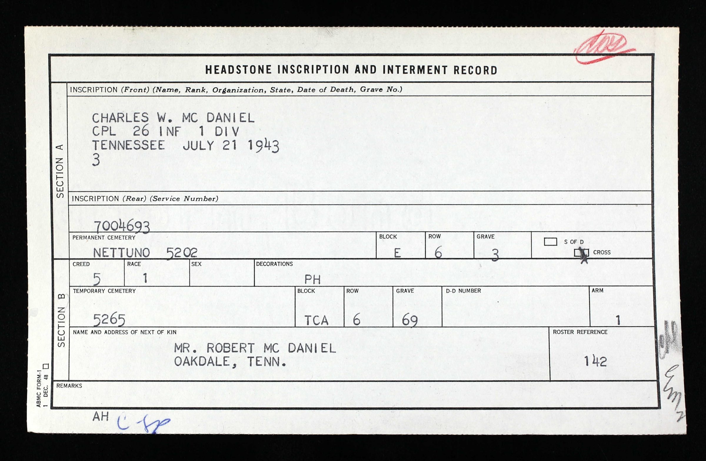 Charles McDaniel was the son of William R. McDaniel. He was born in Tennessee in 1921.