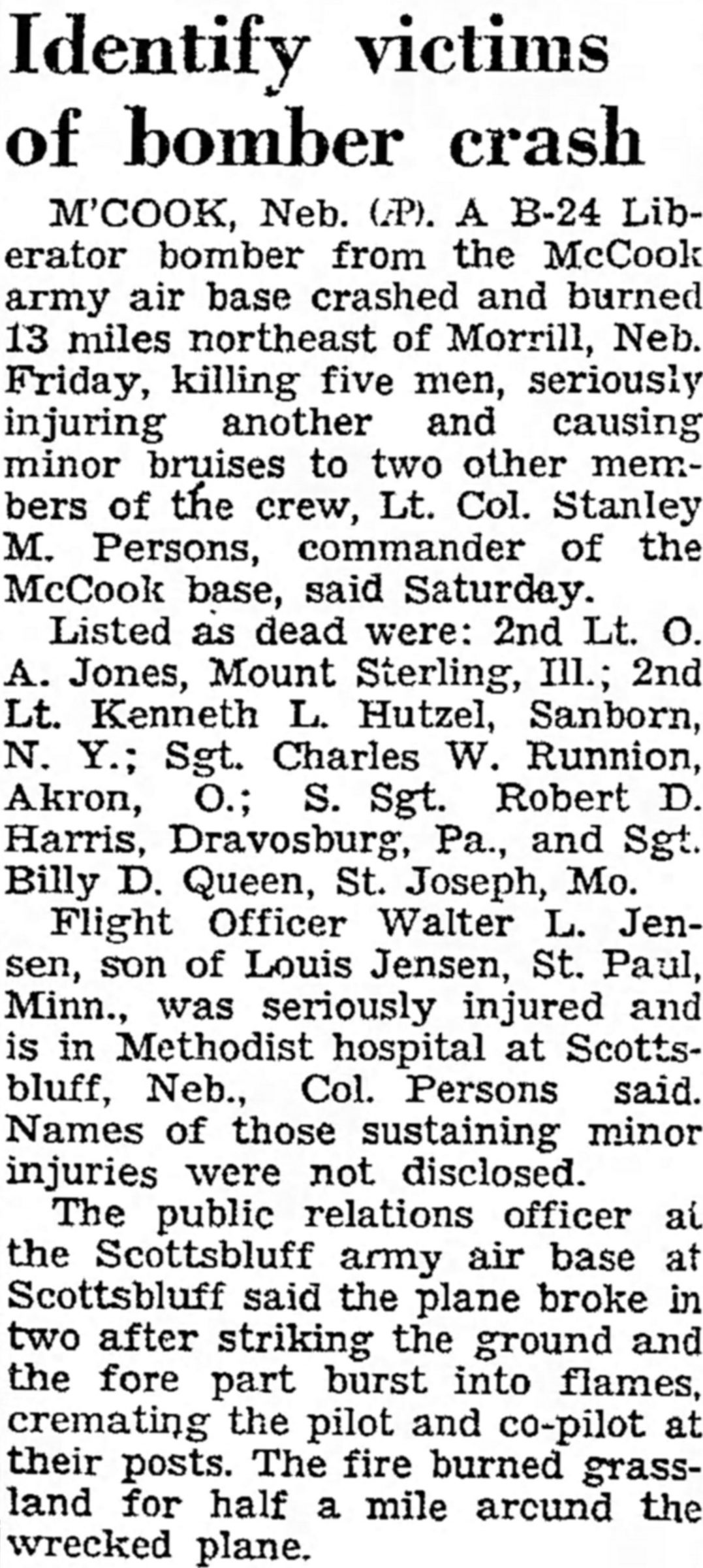 McCook, Neb. A B-24 Liberator bomber from the McCook army air base crashed and burned 13 miles northeast of Morrill, Nebraska, Friday, killing five men, seriously injuring another and causing minor bruises to two other members of the crew, Lt Col Stanley M. Persons, commander of the McCook base, said Saturday.
