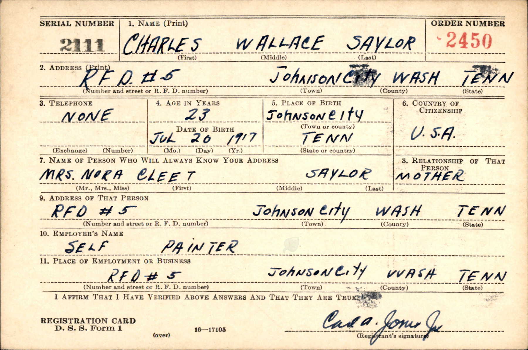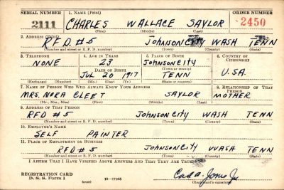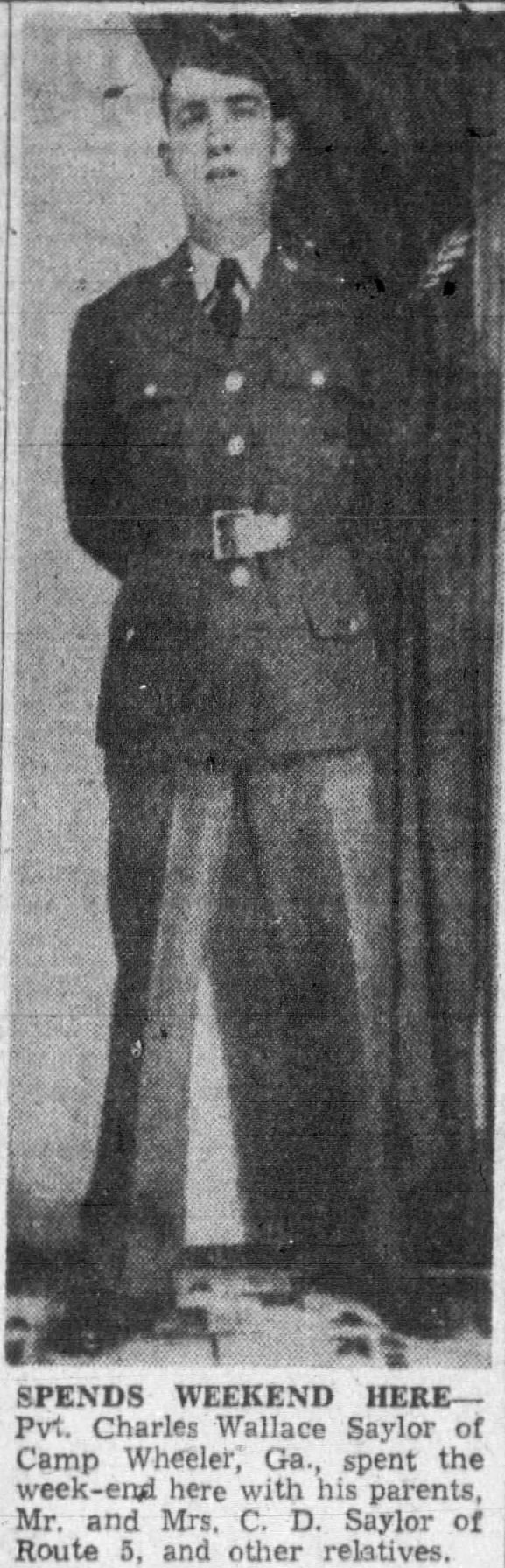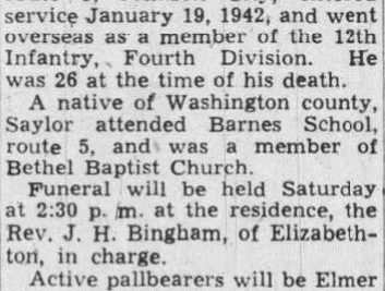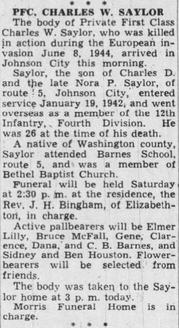 Charles Wallace Saylor was born in Johnson City, Washington County, Tennessee on 20 July 1917. He attended Barnes High School and was a member of the Bethel Baptist Chrurch. Charles worked as a self-employed painter before enlisting in the United States Army at Fort Oglethorpe, Georgia on 20 January 1942 and completing Basic “Boot Camp” Training at Fort Gordon, Georgia. He was assigned to Company C, 1st Battalion, 12th Infantry Regiment, 4th Infantry Division.