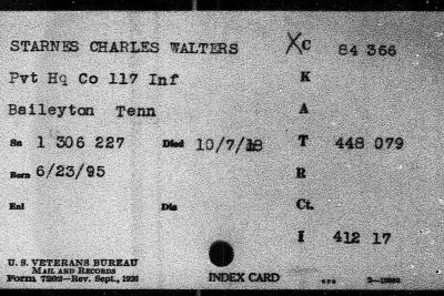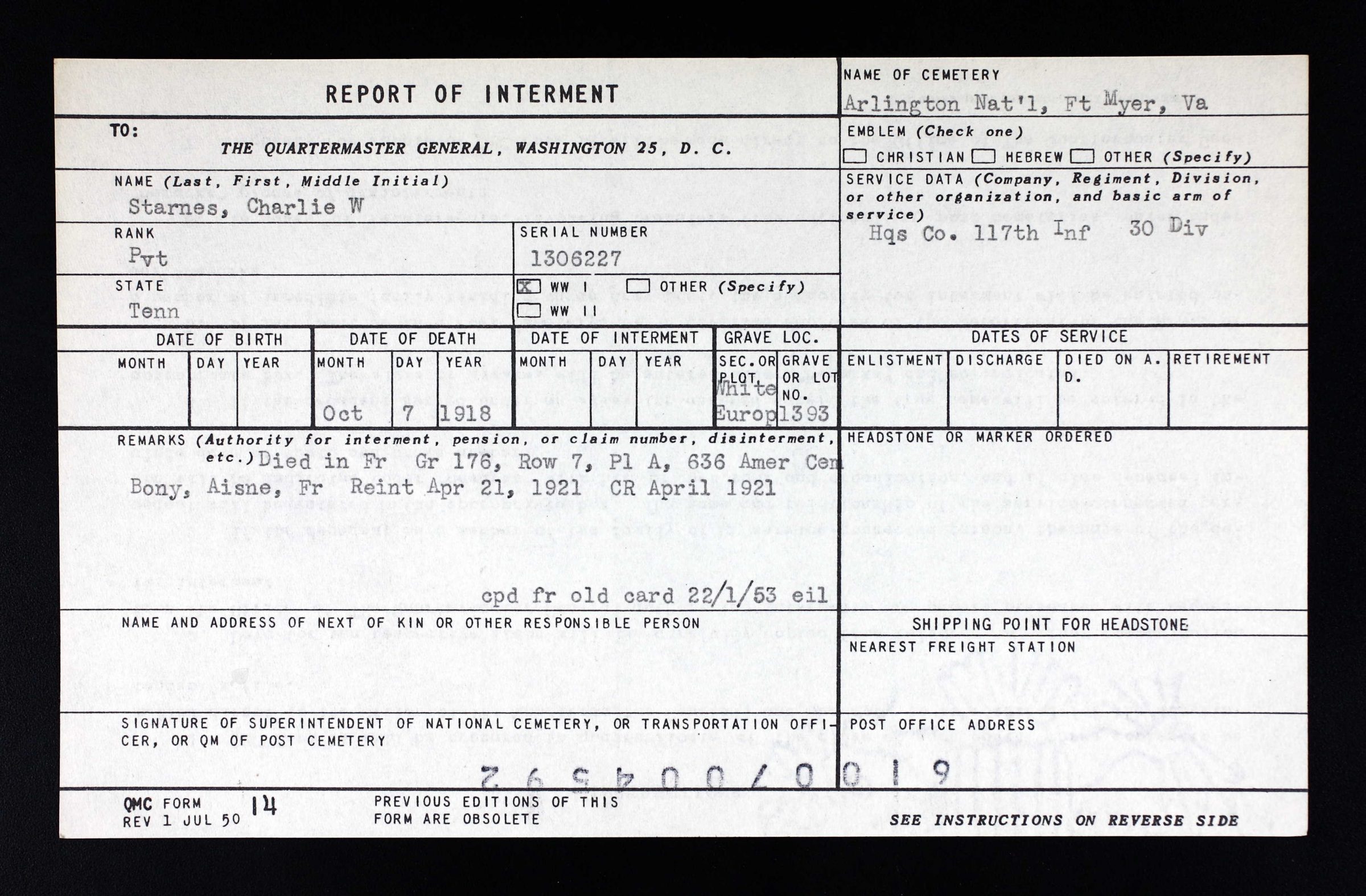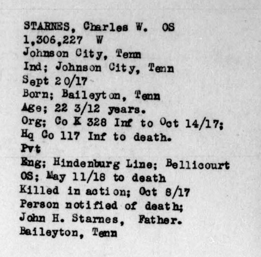 Pvt Starnes was initially buried at the American Cemetery Bony, Aisne in France. He is buried at Arlington National Cemetery, Virginia, Europe, 1393.