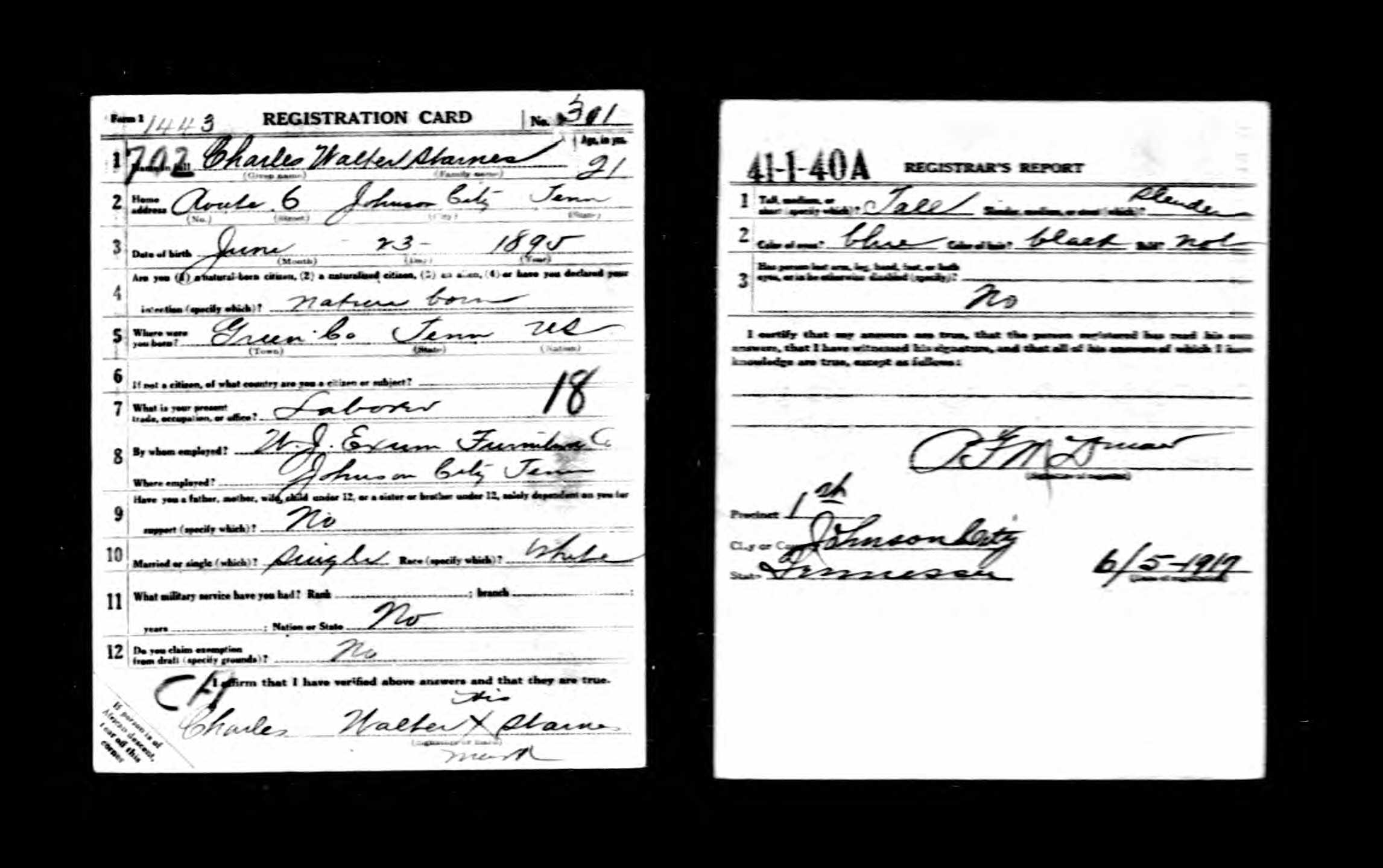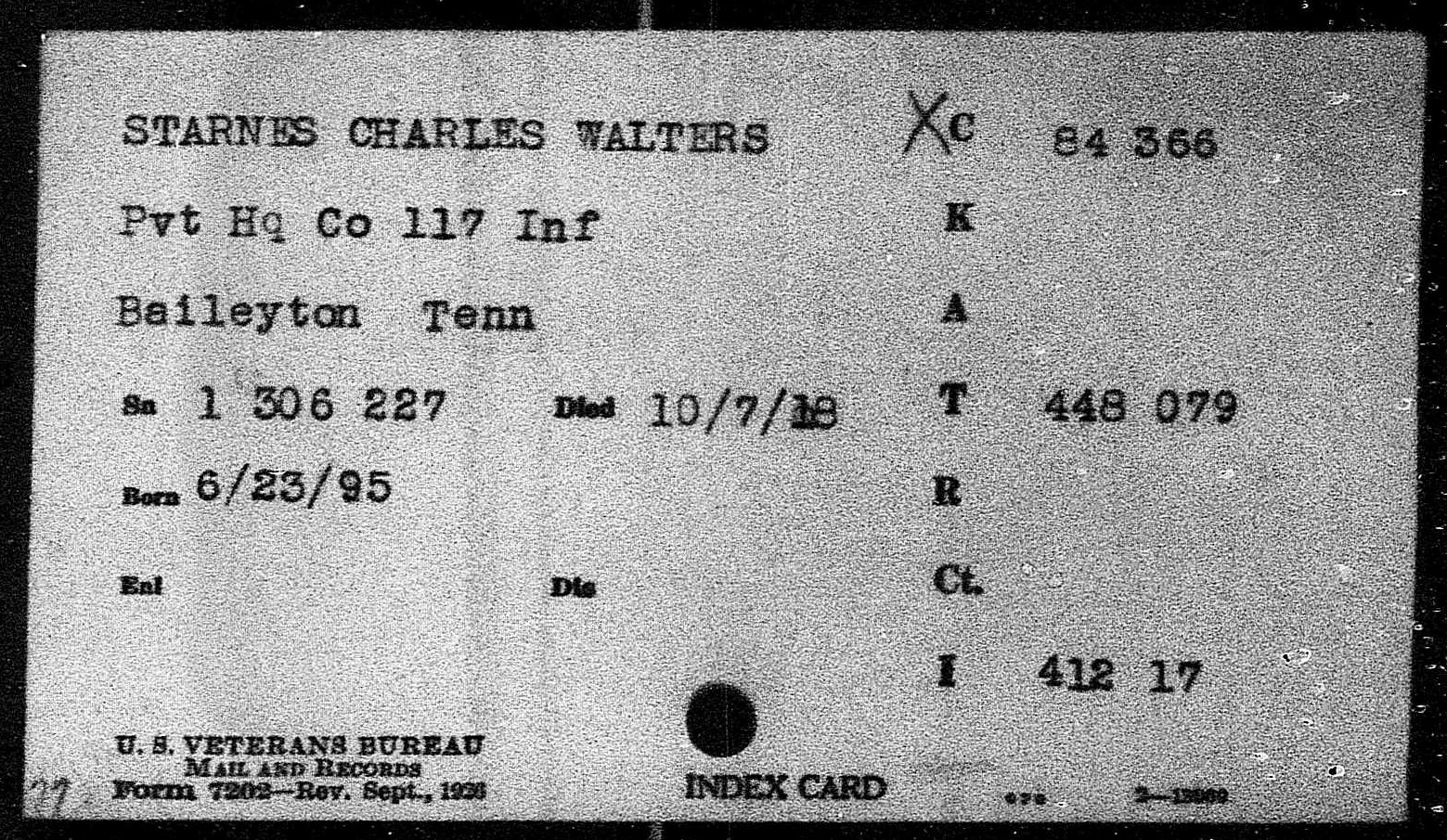 Charles (Charlie) Walter Starnes was born 23 June 1895, Baileyton, Greene County, Tennessee, son of John H. Starnes.