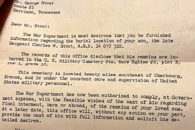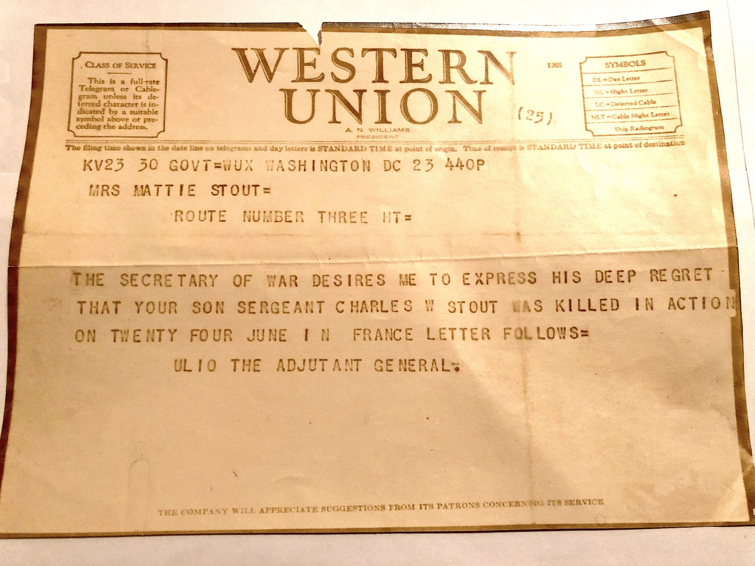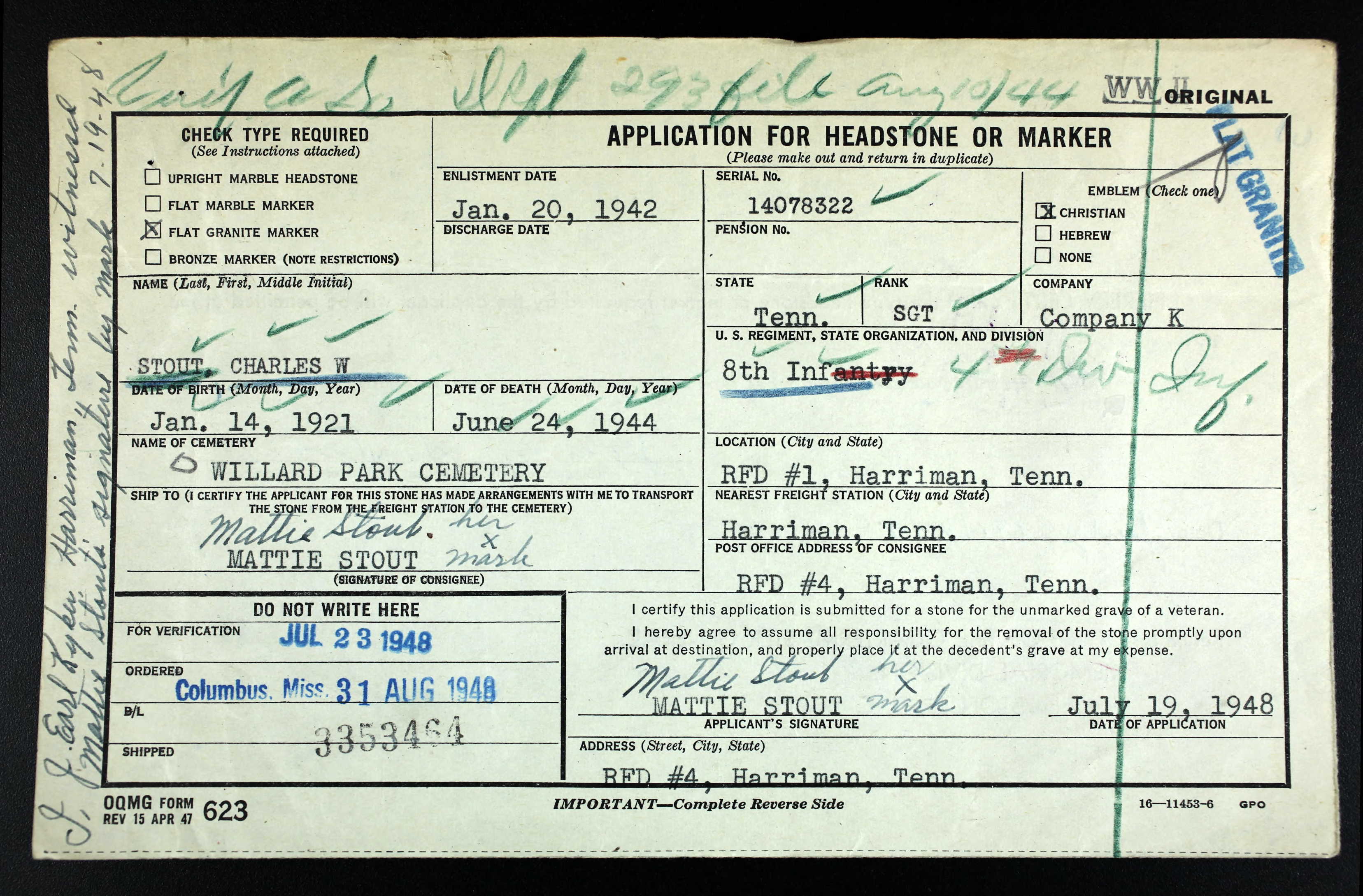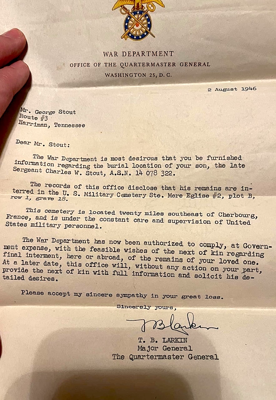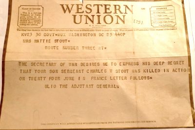 Sergeant Stout, 8th Infantry Regiment, 4th Infantry Division, Company K, US Army, was from Kingston, Tennessee. He was Killed in Action in Normandy, France.