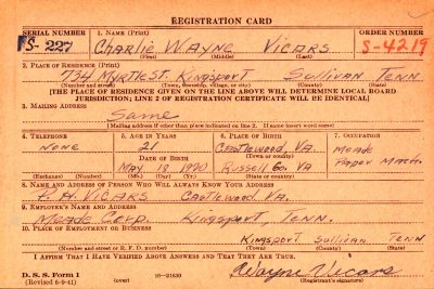 After training at Fort Benning, Ga., and Ft. Jackson, S.C. he went overseas in 1944, and was a member of the 30th Infantry Division. He is survived by his parents; two brothers, Elmer of Nickelsville and Okley Vicars of Castlewood; and a sister, Mrs. Claude Mays of Castlewood; also two nephews, Larry Vicars, Nickelsville, VA, Tim Vicars, Abingdon, VA, and two nieces, Cathy Phelps and Ann Cubine of Big Stone Gap, Virginia.