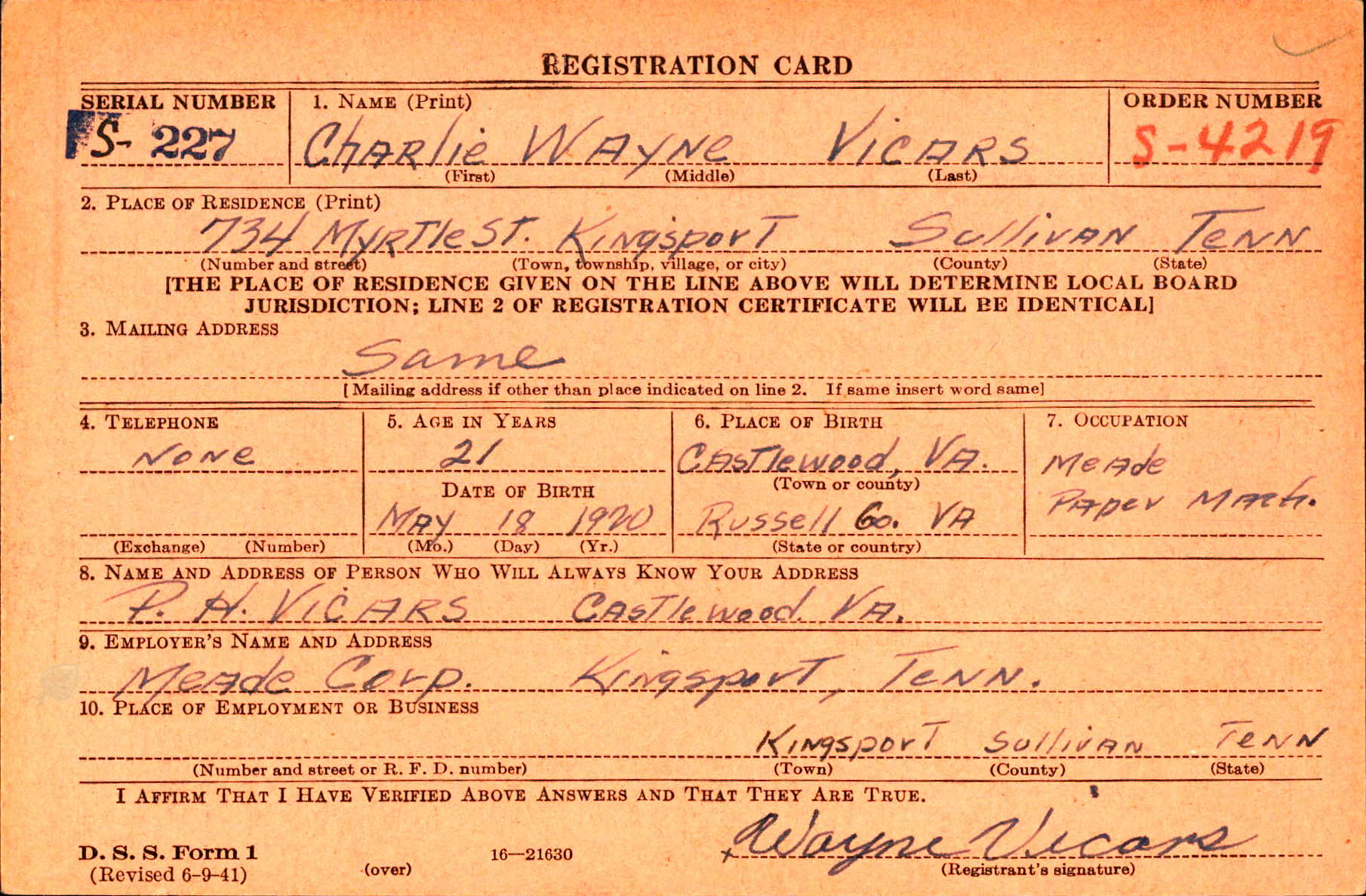 Charles Wayne Vicars was born on 18 May 1920 in Castlewood, Virginia. He was the son of Peter Henry Vicars and Mary Catherine Litton.