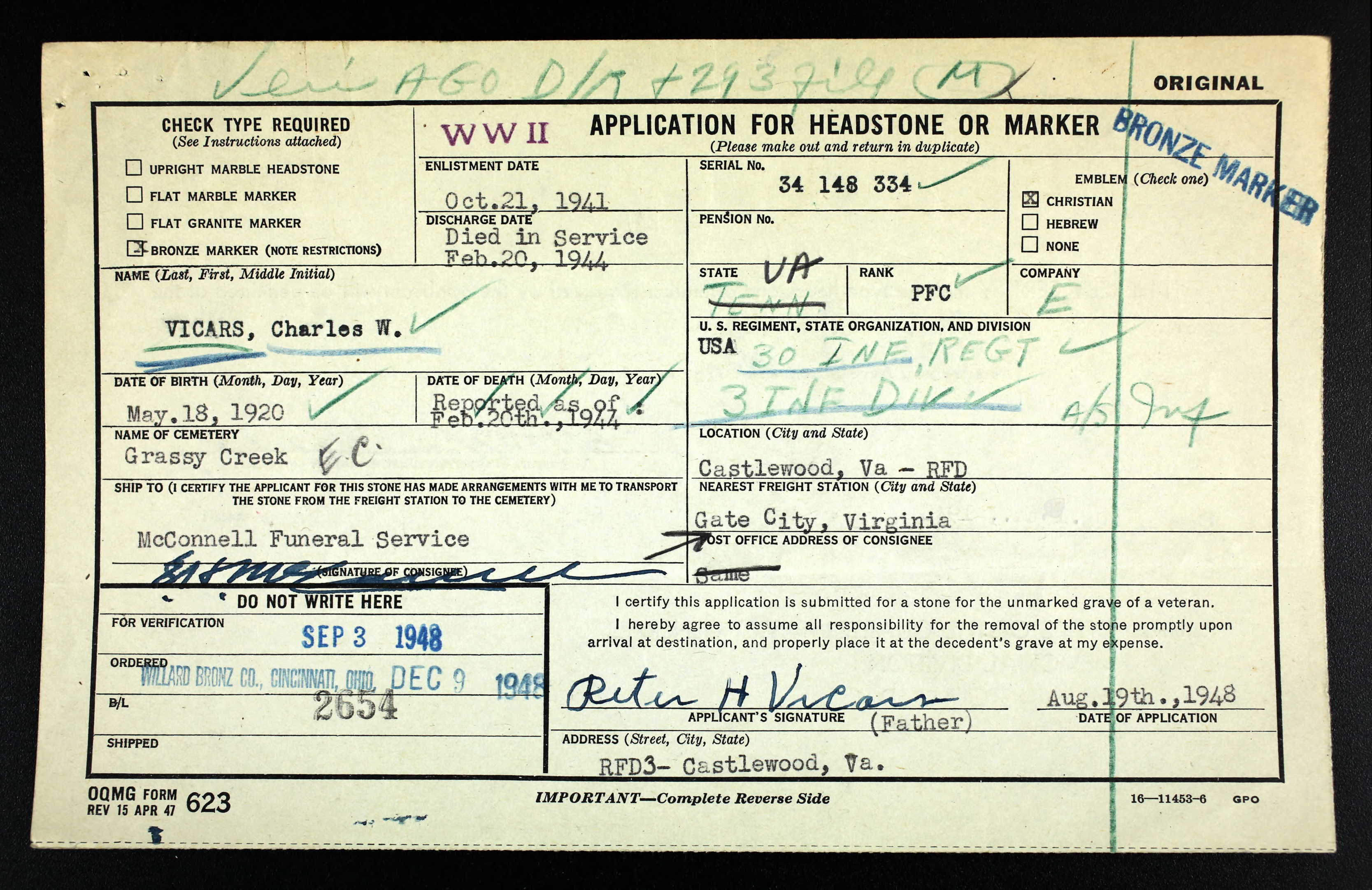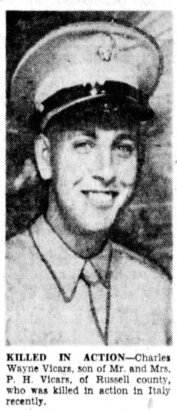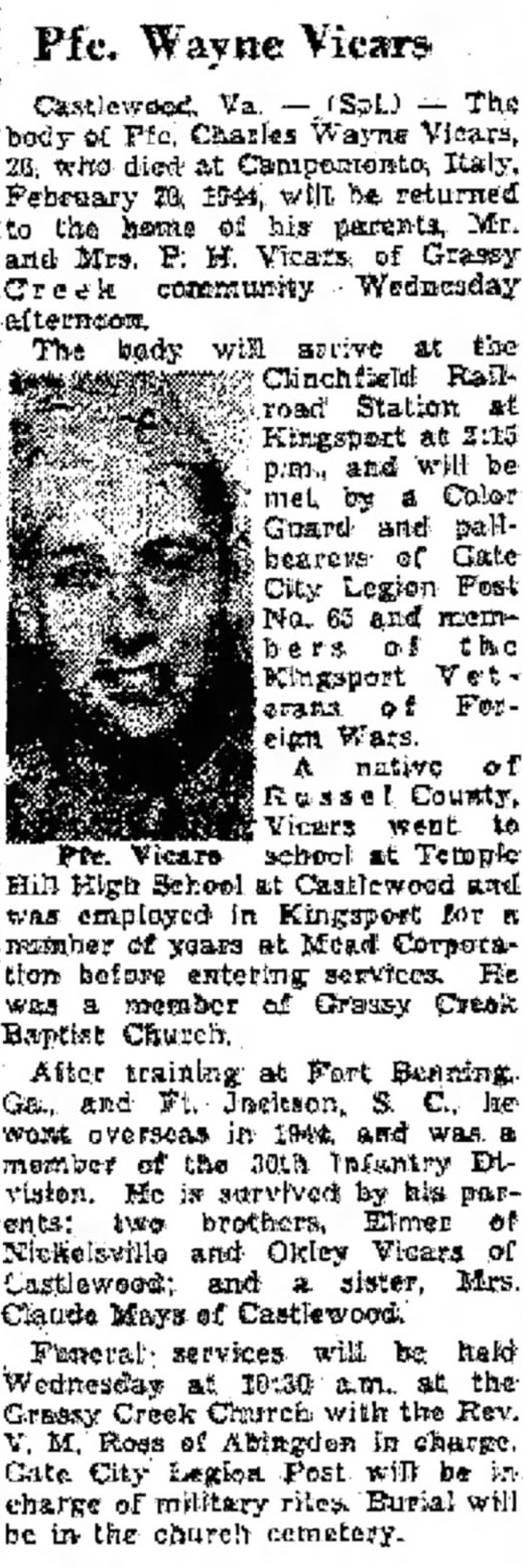 Castlewood, Va. – The body of Pfc. Charles Wayne Vicars, 26, who died at Compomonto, Italy, February 20, 1944, will be returned to the home of his parents, Mr. and Mrs. P.H. Vicars of Grassy Creek community. The body will arrive at the Clinchfield Railroad Station at Kingsport and will be met by a Color Guard and pallbearers of Gate City Legion Post No. 63 and members of the Kingsport Vetarans of Fereign Wars.
