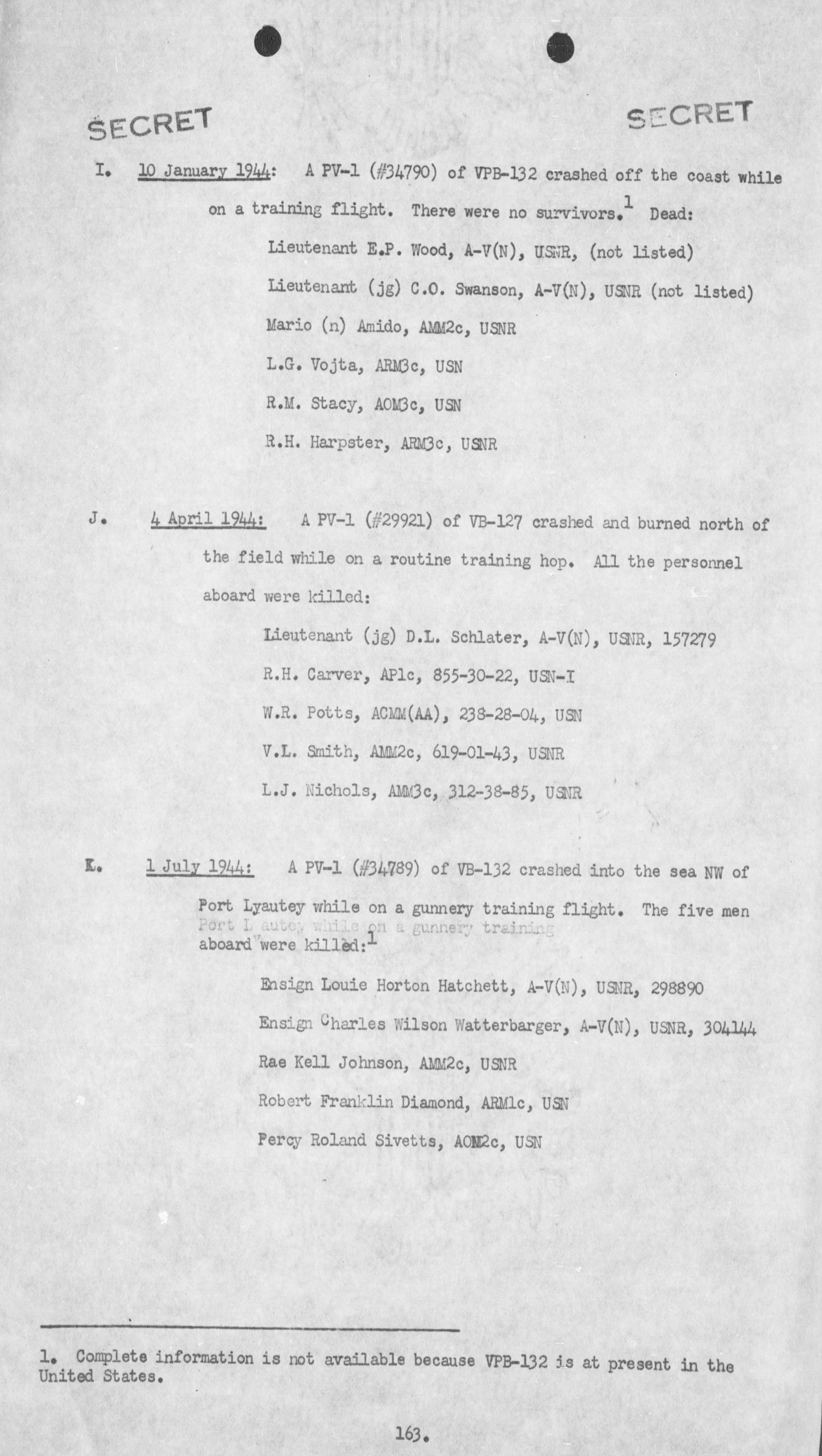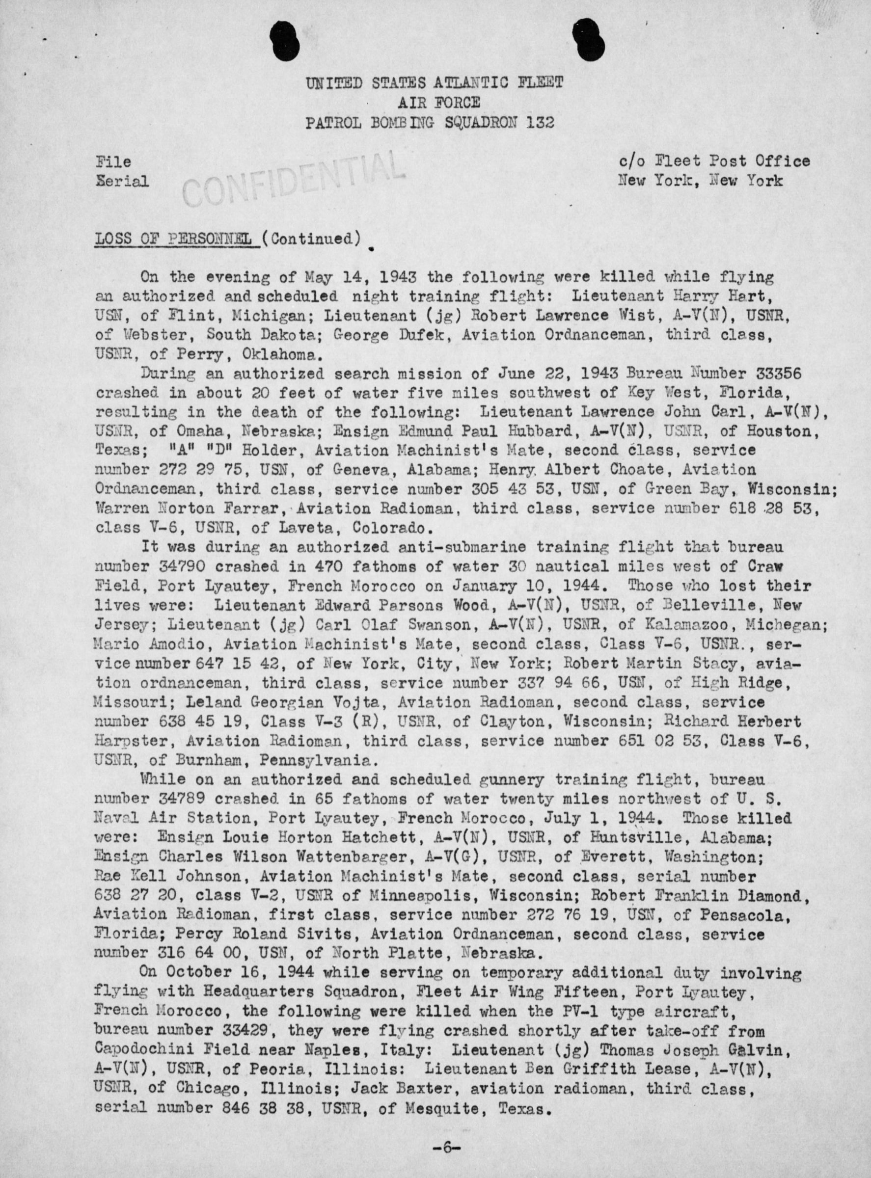 July 1 – While conducting an authorized and scheduled gunnery training flight on a sleeve target by a utility plane, PV-1 aircraft, Bureau Number 34789, of this squadron, crashed into the sea twenty miles northwest of the U.S. Naval Air Station Port Lyautey, French Marocco, at 1100 Able. Killed in the crash were the pilot, Ensign Louie Horton Hatchett, of Huntsville, Alabama, Enisn Charles Wilson Wattenbarger, of Everett, Washington and the crew, consisting of Rae Kell Johnson, Aviation Machinist´s Mate, second class, of Minneapolis, Wisconsin; Robert Franklin Diamond, Aviation Radioman, First Class of Pensacola, Florida; Percy Roland Sivits, Aviation Ordnanceman, second Class, of North Platte, Nebraska, all of the permanent squadron personnel. None of the bodies were recovered, nor was the plane, which was observed to explode when it hit the water, although a surface vessel arrived at the scene twenty minutes after the crash. Sivits had been with the squadron since shortly after it was commissioned. Ensign Hatchett and Diomond joined the squadron shortly before it left the United States for Africa, and Ensign Watterbarger and Johnson reported since the squadron arrived in Africa.