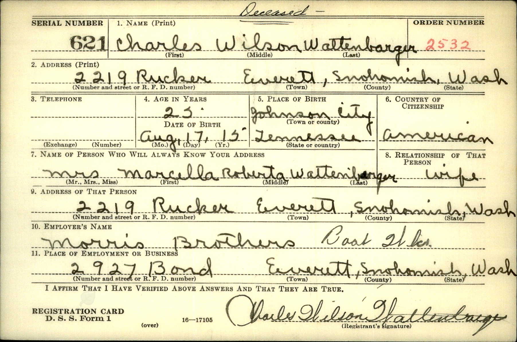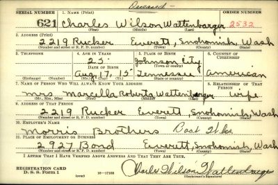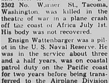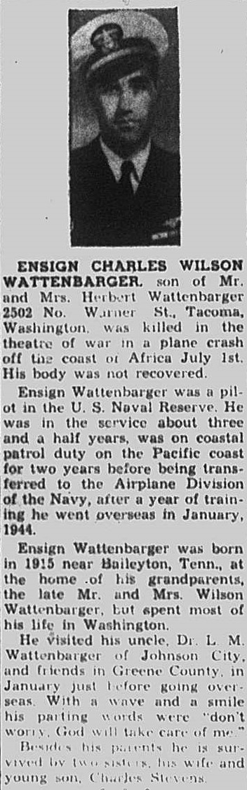 Ensign Charles Wilson Wattenbarger, son of Mr. and Mrs. Herbert Wattenbarger, 2502 No. Warner St., Tacoma, Washington, was killed in the theatre of war in a plane crash off the coast of Africa July 1st. His body was not recovered.