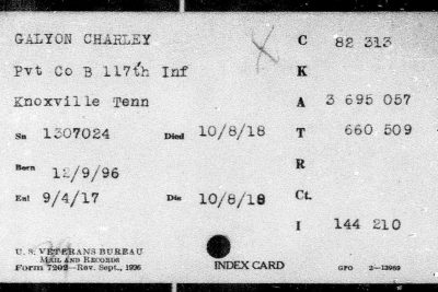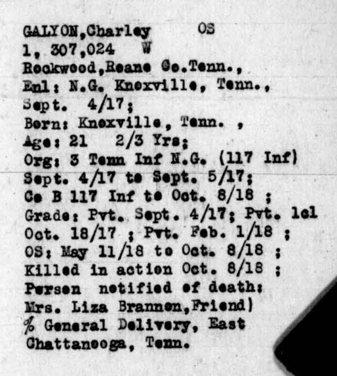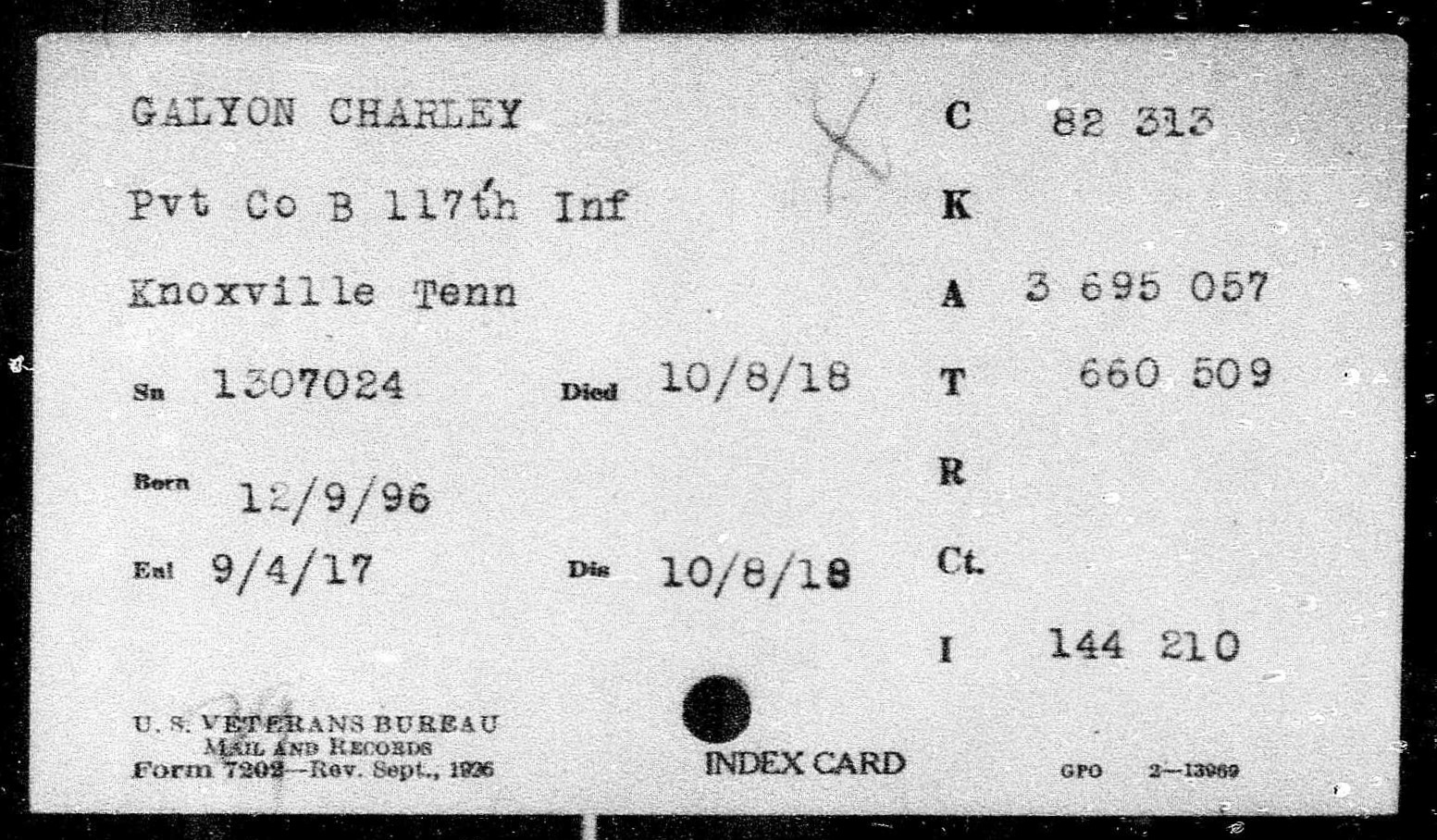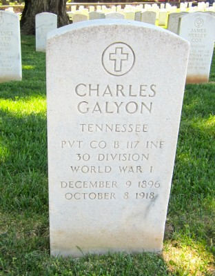 Charles (also Charley) Galyon was born in Knoxville, Tennessee to John Wesley Galyon and Maude Johnson. He was killed in action. Pvt Galyon was initially buried at the American Cemetery at Bony, France.