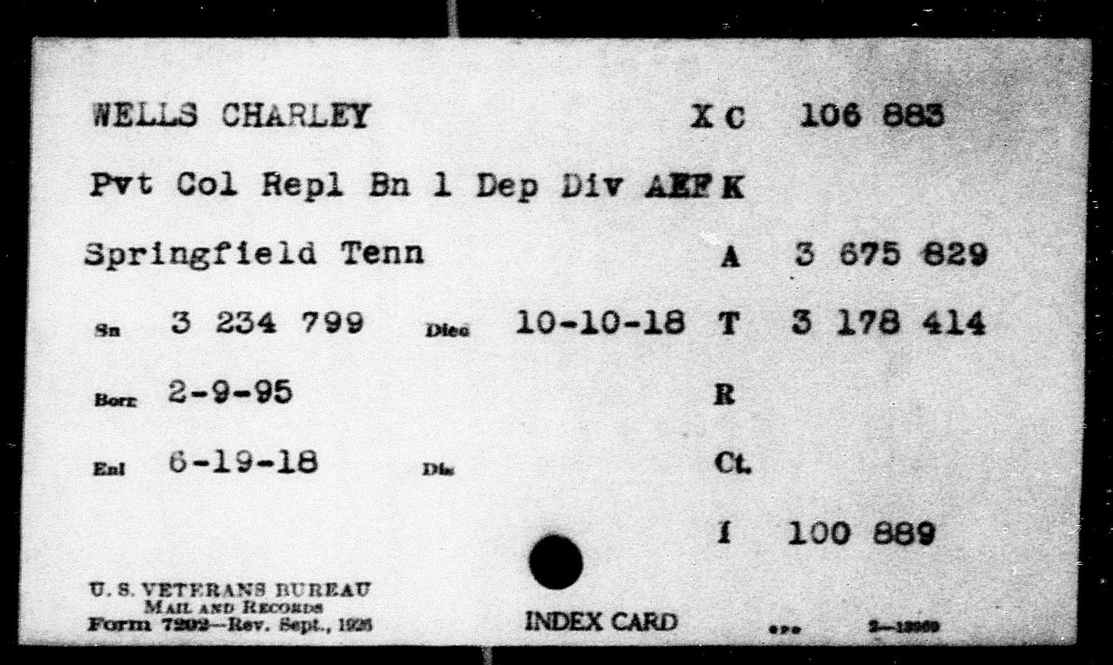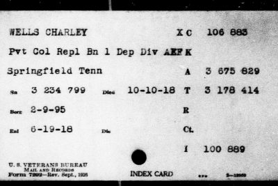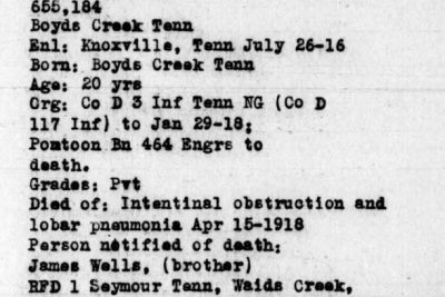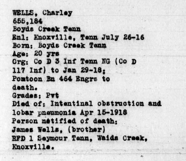 Private Charley Wells was born in Boyds Creek, Tennessee. He died of intentinal obstruction and broncho pneumonia on 30 December 1918 and is interred at the Oise-Aisne American Cemetery, Romagne, France.