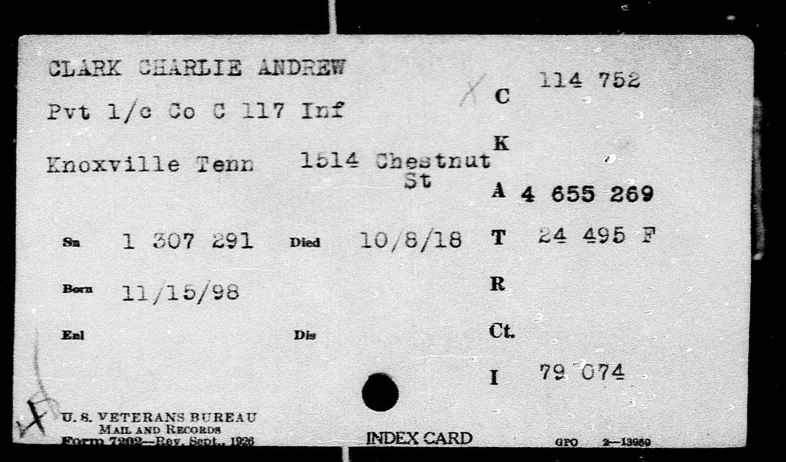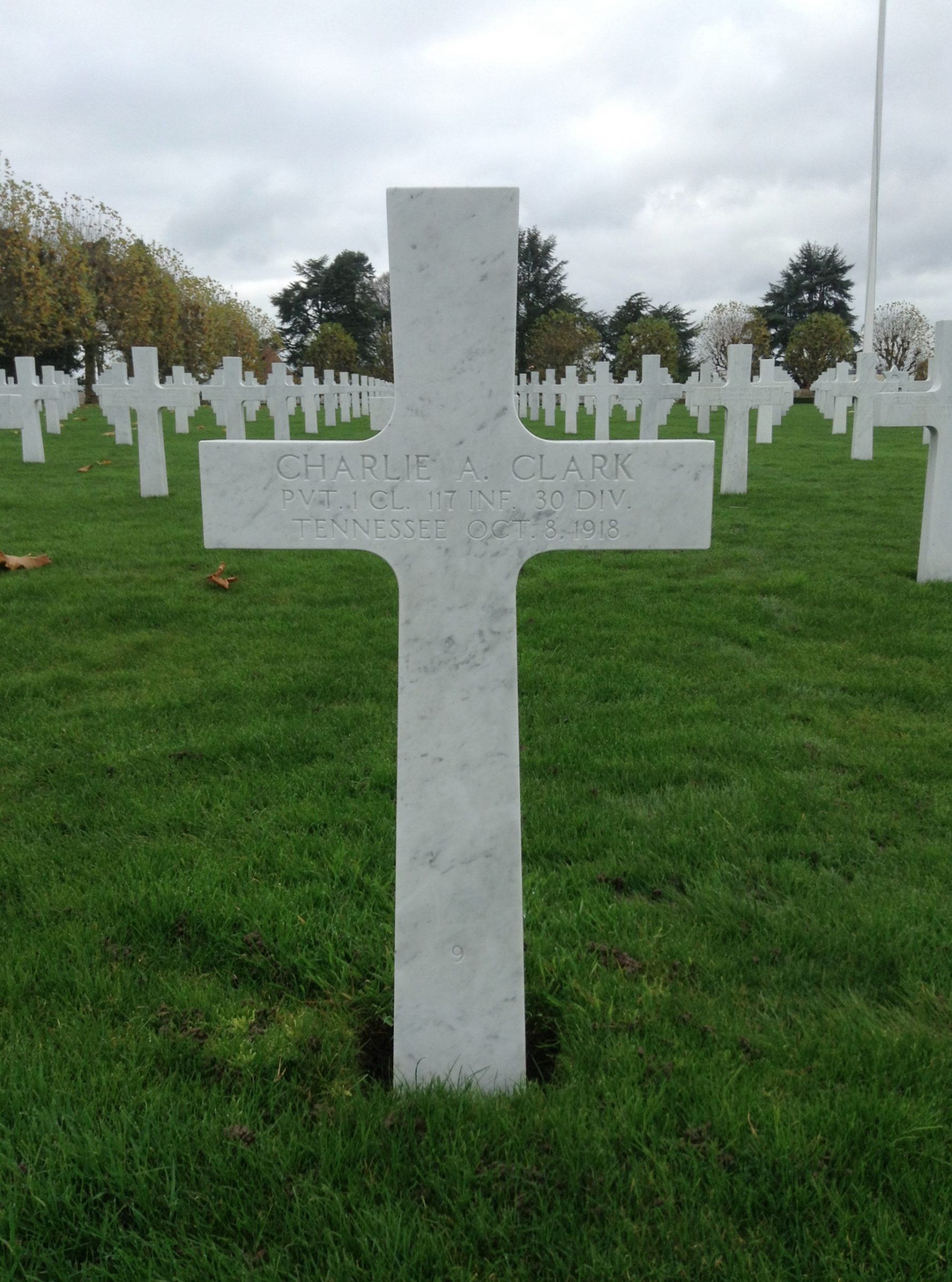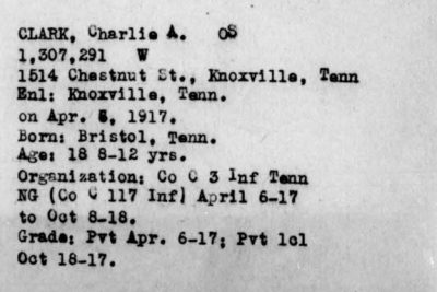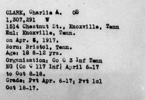 Charles Andrew Clark answered the call to the colors in April 1917. He trained at Camp Sevier, SC, as a member of Company L, 117th Infantry, 30th Division. Became a member of the American Expeditionary Force in May 1918. Took part in all battles of his organization until killed October 8, 1918, near Prémont. He is buried in Somme American Cemetery and Memorial in Bony, France (Plot A, Row 18, Grave 9).