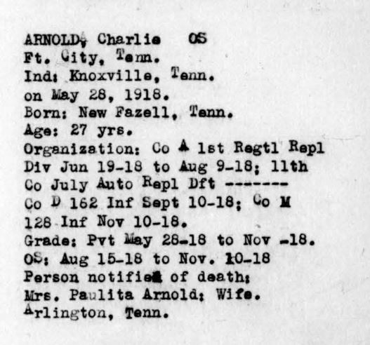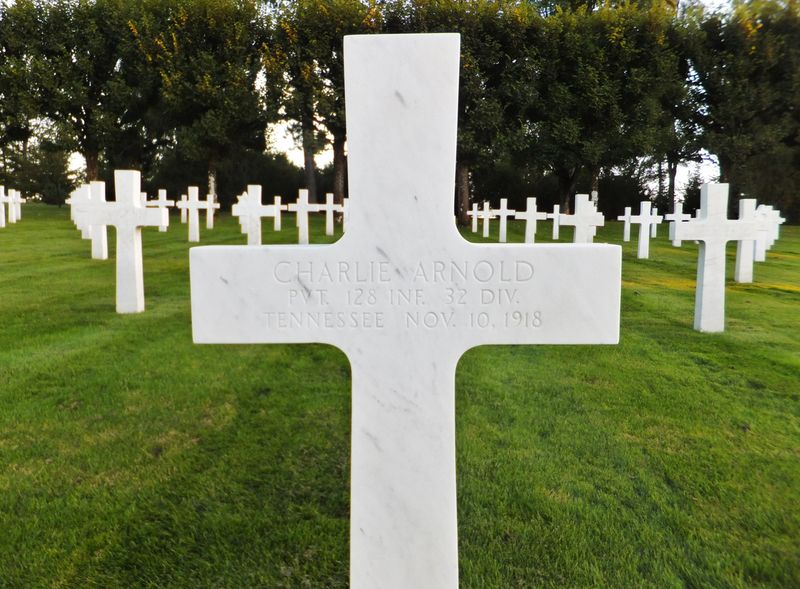 Charles “Charlie” Arnold was called into service May 27, 1918, and was placed in July at the Automatic Replacement Draft at Camp Pike, AR. Sailed for overseas duty in July, and upon arrival he was assigned to Company M, 128th Infantry, 32nd Division. He was killed in action in the Argonne Forest battle on November 10, 1918, one day before the armistice was signed.
