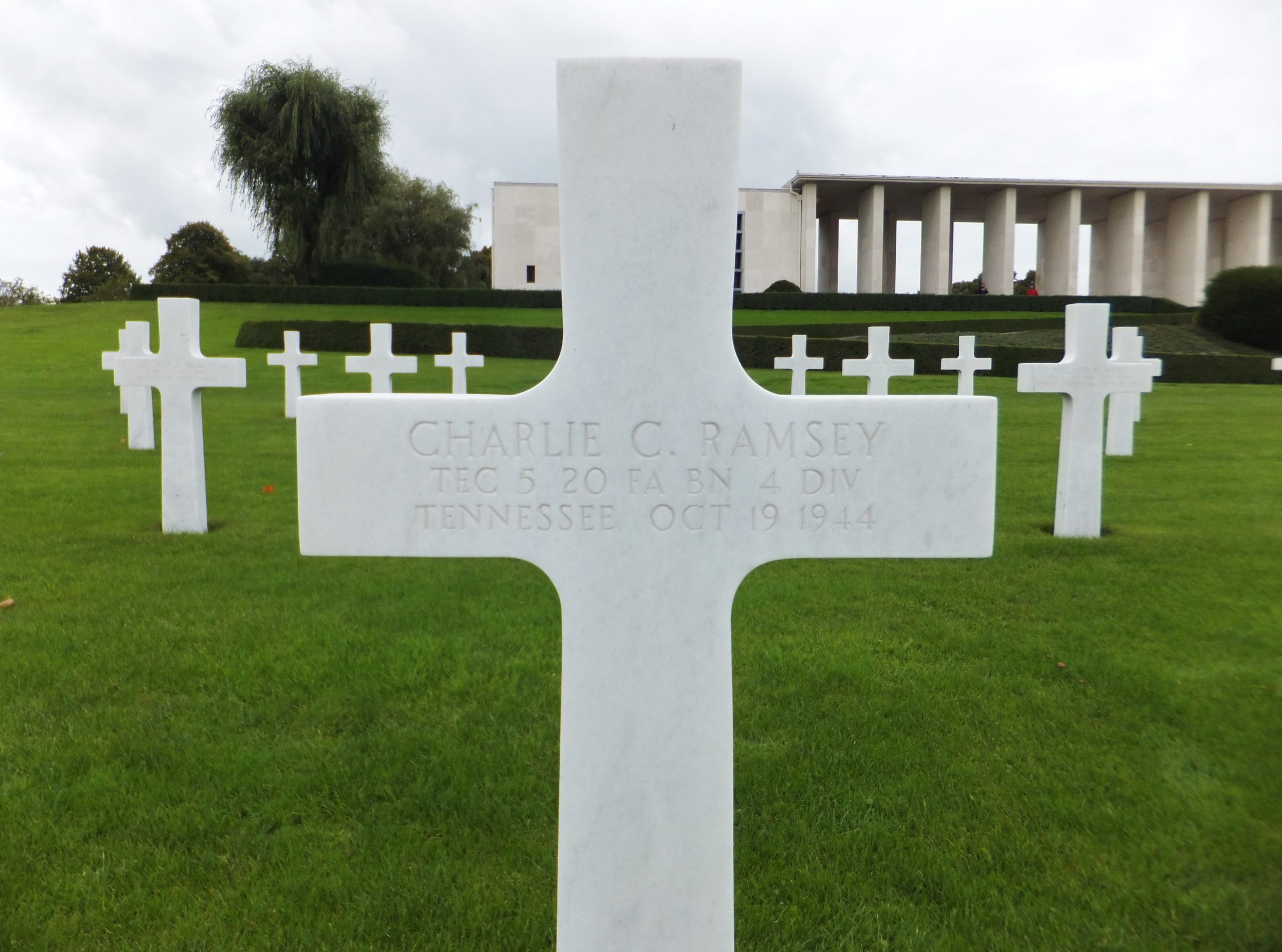 He enlisted at Fort McPherson, Atlanta, Georgia on the 13th of January 1941. He was assigned to the 20th Field Artillery, 4th Infantry Division. The 4th ID with the 20th Field Artillery Battalion departed New York City, New York on 18th of January 1944 aboard the U.S.S. George Washington and arrived in Liverpool, England on the 29th of January 1944. The 20th was equipped with 155 mm artillery. The Division landed at Utah Beach on the 6th of June 1944.The Division fought through Normandy through France and into Belgium. In October 1944, the division was fighting in Belgium to take the Siegfried Line. Tech 5 Ramsey died of his wounds on the 19th of October 1944. Buried at Henri-Chapelle American Cemetery, Belgium, B, 4, 14.