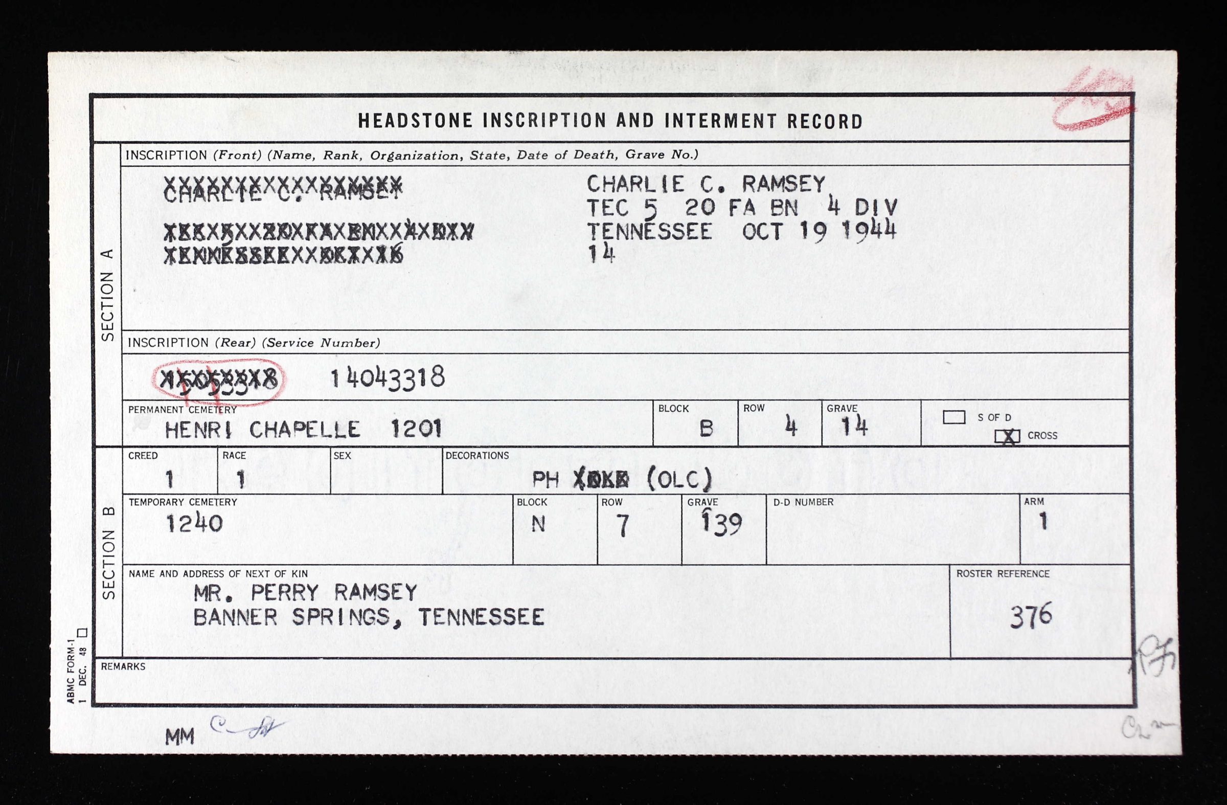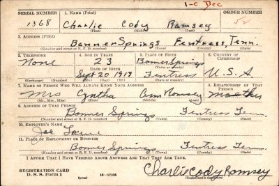 Technician 5th Class Charles Cody Ramsey, #14043318 US Army was born at Banner Springs, Tennessee. He was the son of William Perry Ramsey and Cynthia A. Ramsey of Banner Springs, Tennessee. His siblings were Bessie E., Edna E., William H., Lawrence, Lorene, Ciella and Ovid.