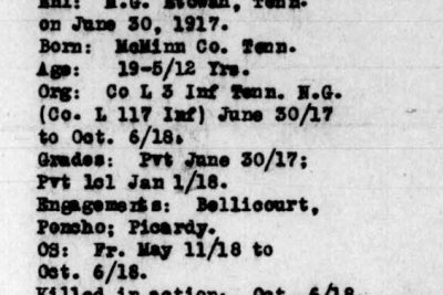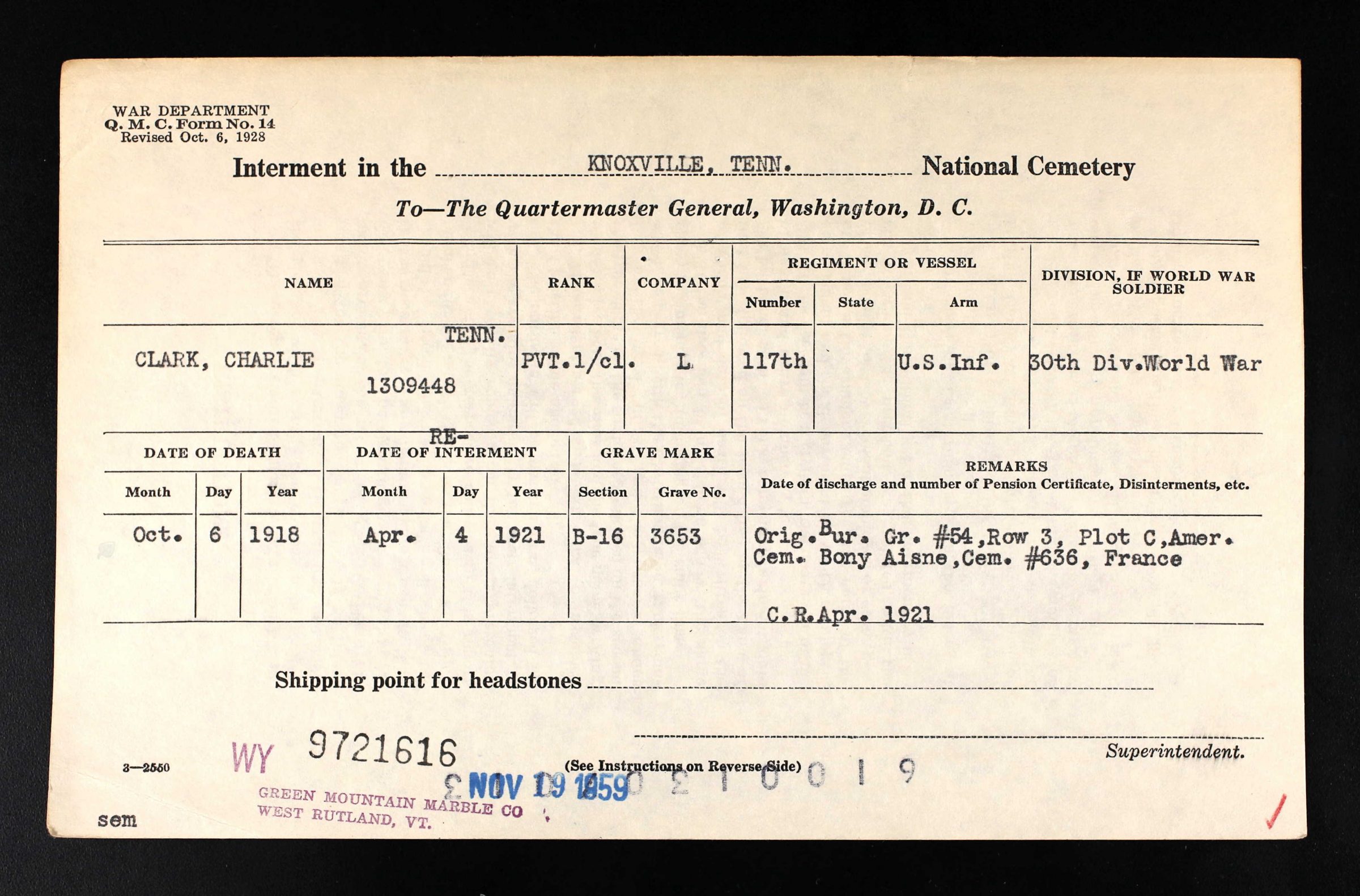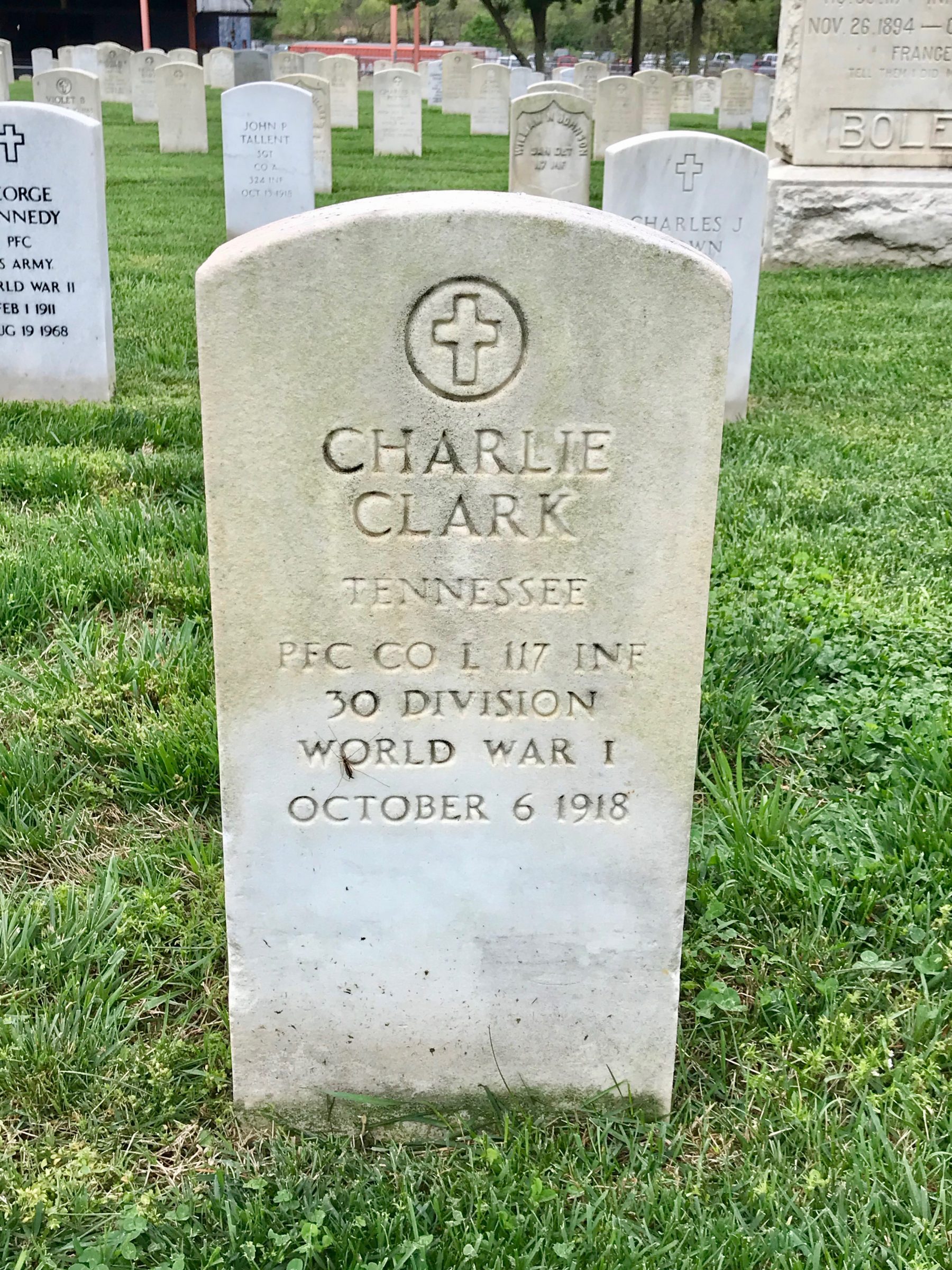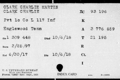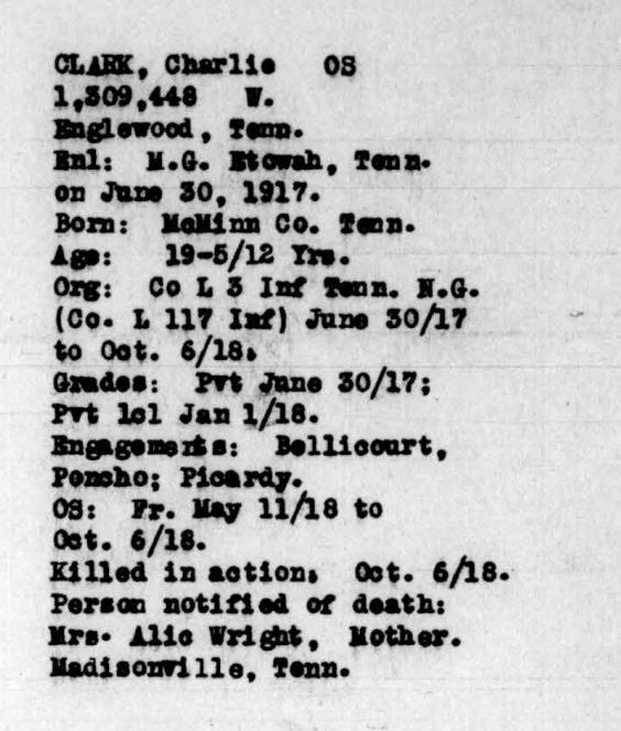Charlie Clark was born in McMinn County, Tennessee, son of Alie Wright. PFC Clark was killed in action at the age of 19 and was originially buried at the American Cemetery Bony, Aisne, France. He is buried in Knoxville National Cemetery (Plot B-16, Site 3653).