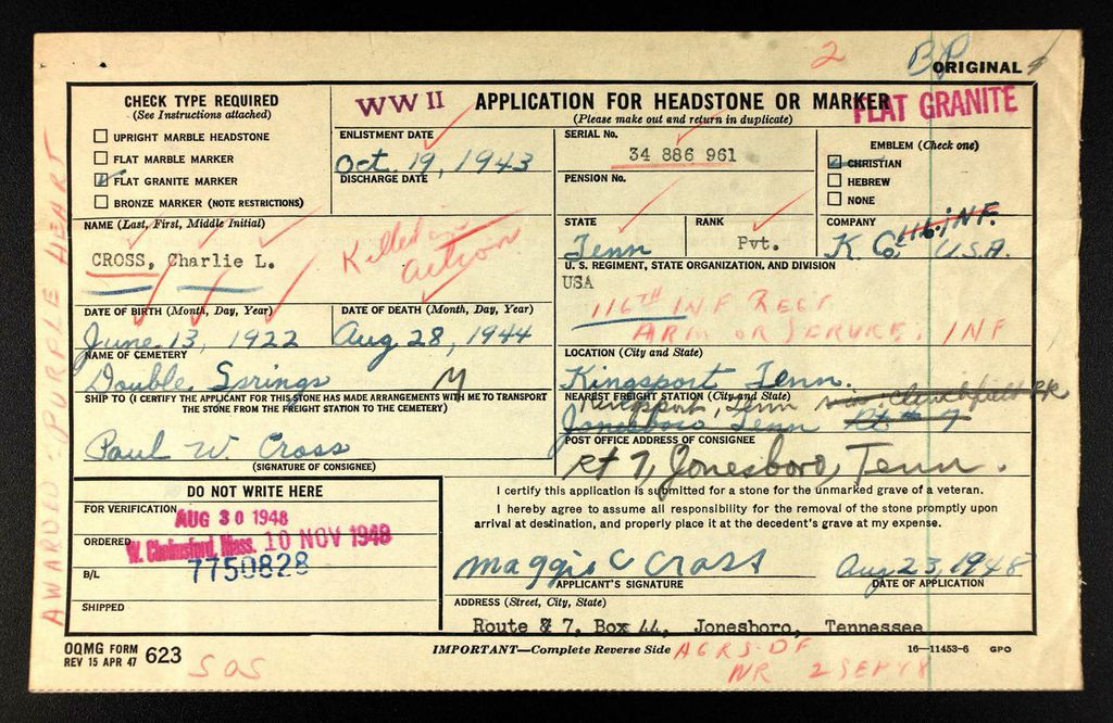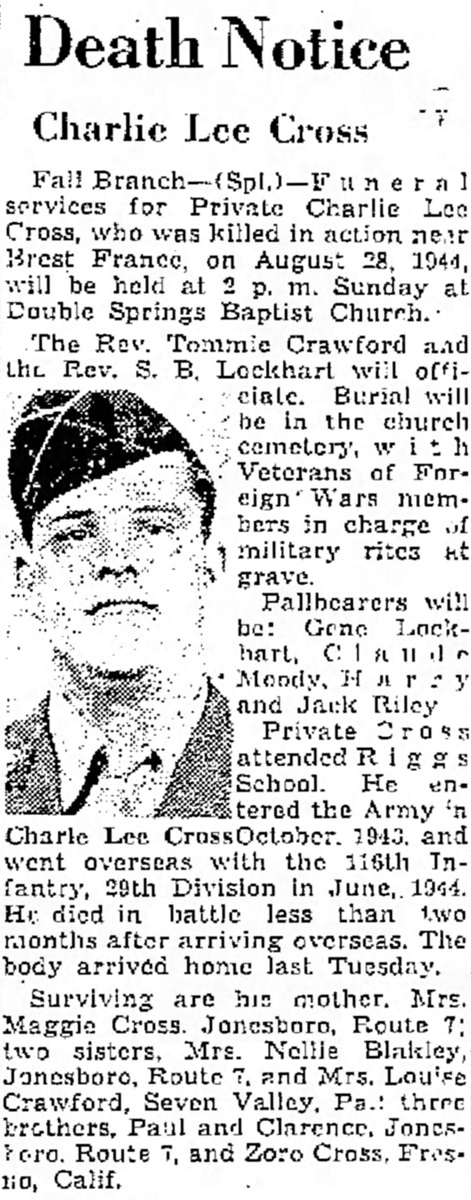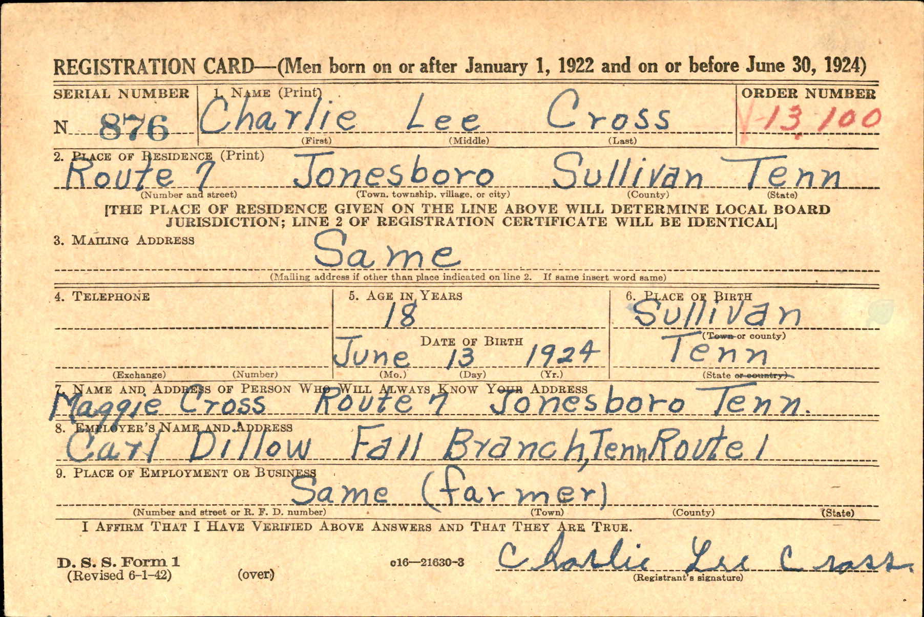Charlie Lee Cross was born 13 June 1922 in Fall Branch, Sullivan County, Tennessee. He was the son of Samuel C. Cross and Margaret Elizabeth “Maggie” Fox. He was the husband of the former Miss Dorothy Fink
