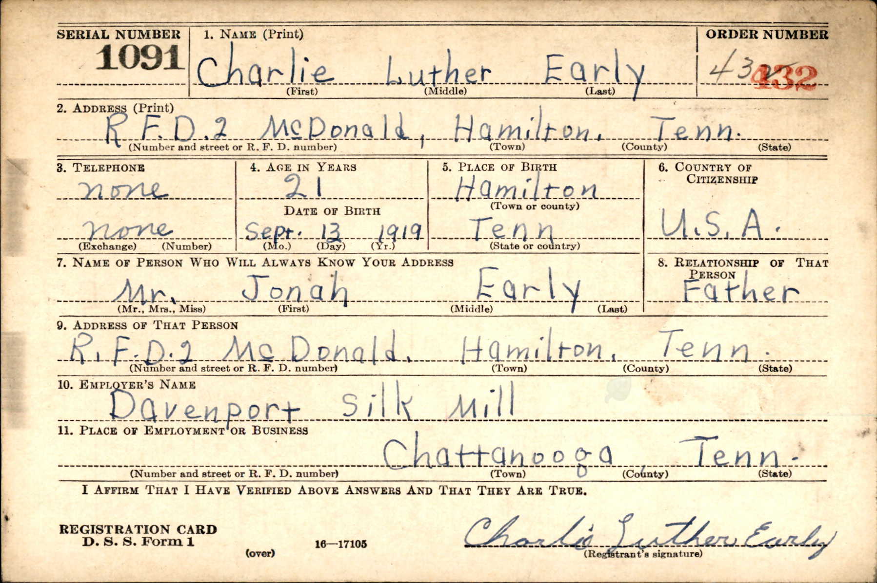 Charlie Luther Early was the son of Jonah Marion Early and Martha Louise Grisham.