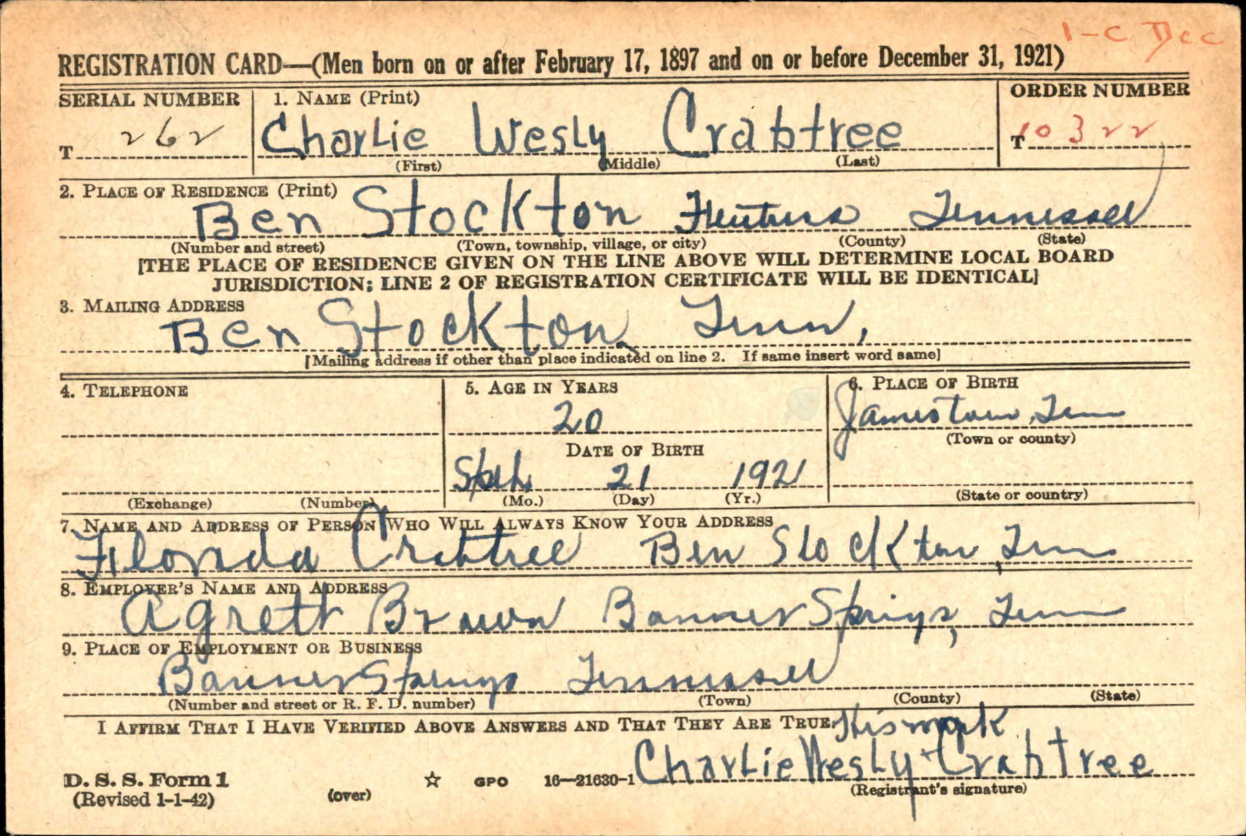 Charlie Wesly Crabtree was the son of Jessie Franklin Crabtree and Florida Jane Carpenter.