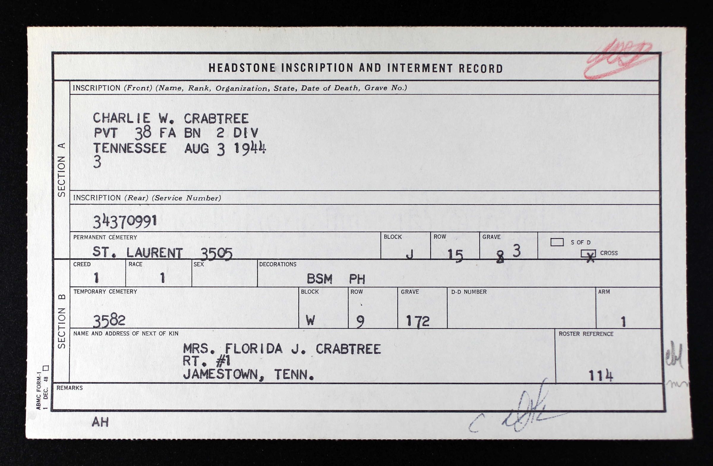 Private Charlie W. Crabtree was assigned to the 38th Field Artillery Battalion, 2nd Infantry Division. The division was involved in the battle for St. Lo on the Normandy peninsula.
