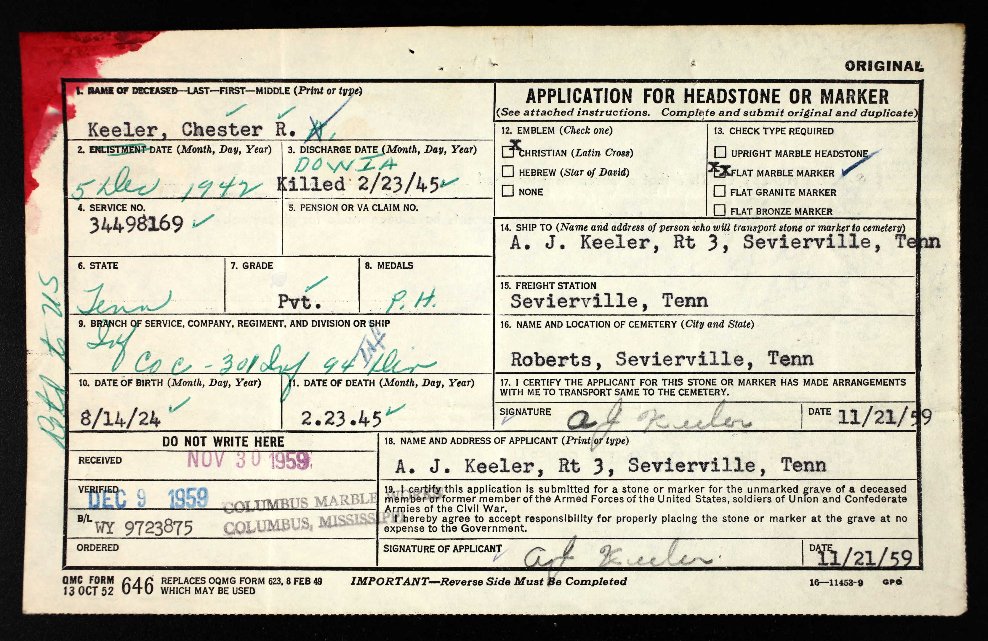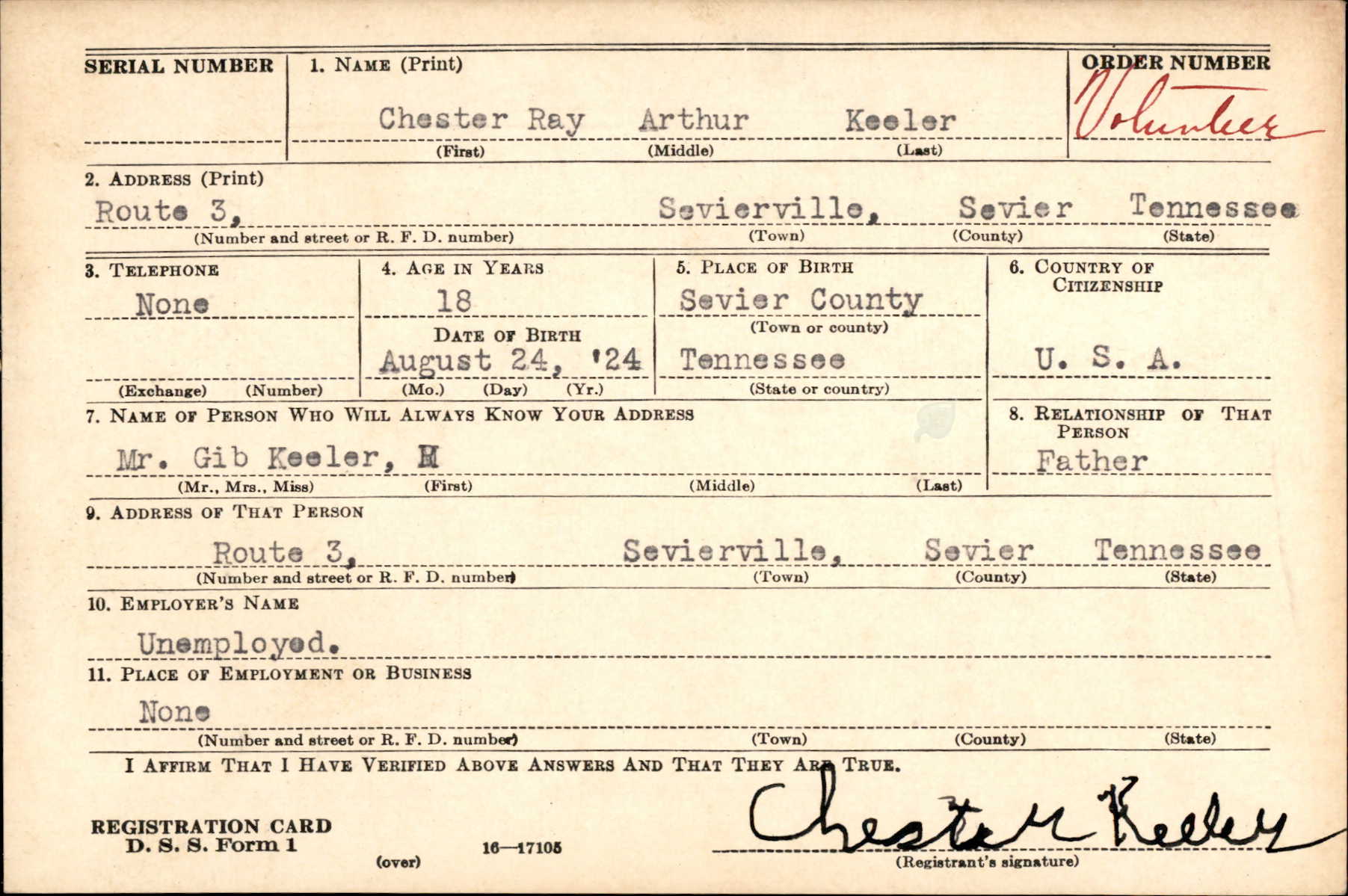 Chester Ray Arthur Keeler was born on 14 August 1924 in Sevierville, TN. He was the son of Gib and Dicie Hurst Keeler.