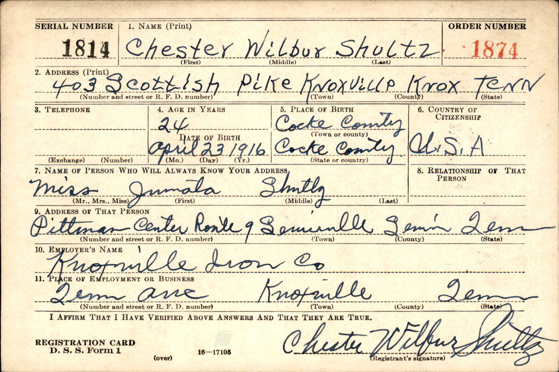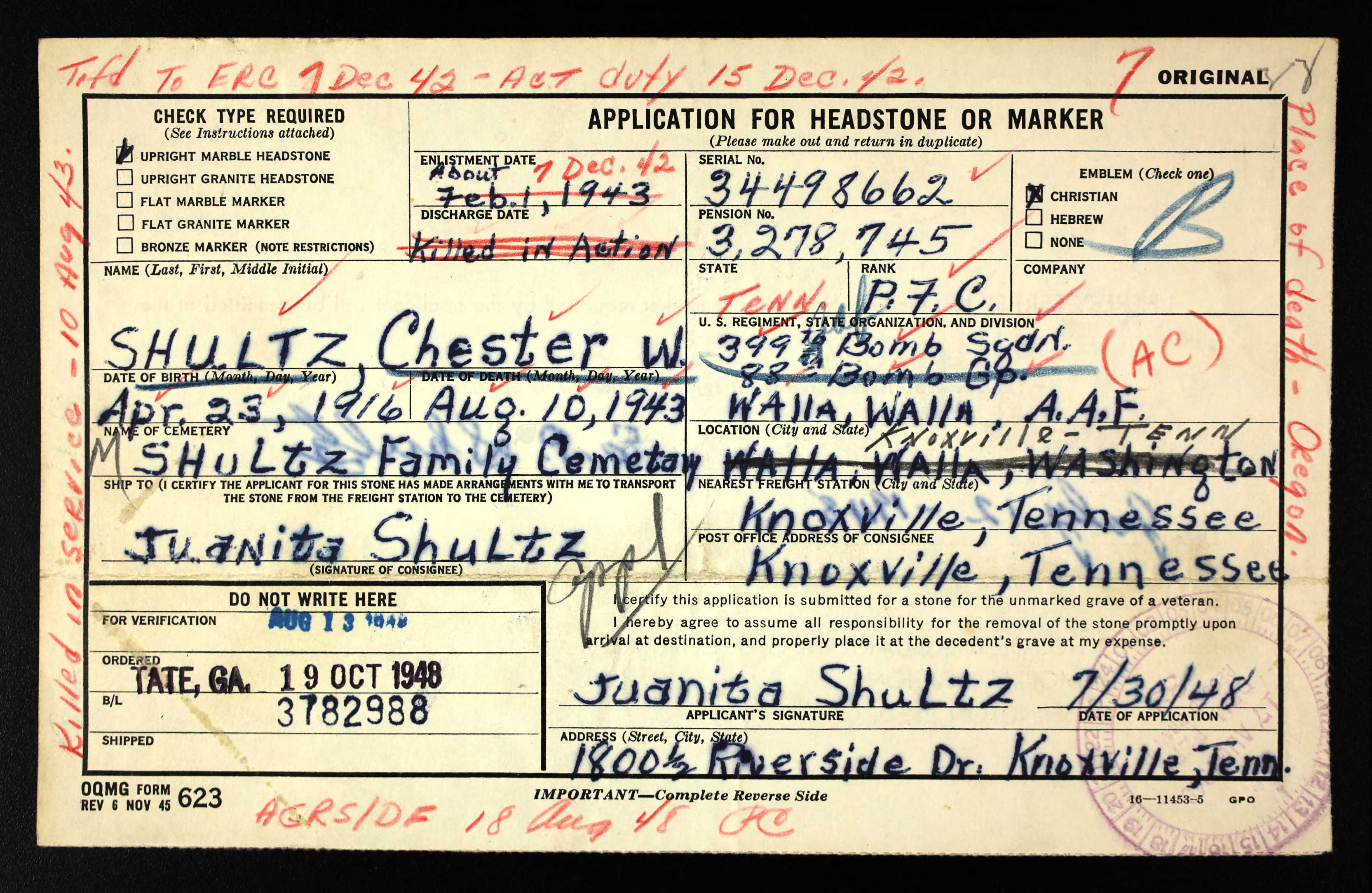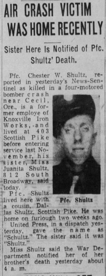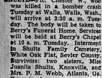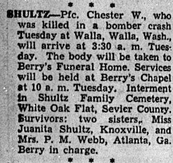 Pfc. Chester W. Shultz, who was killed in a bomber crash Tuesday at Walla, Walla, Wash., will arrive at 3:30 a.m. Tuesday. The body will be taken to Berry’s Funeral Home. Interment in Shultz Family Cemetery, White Oak Flat, Sevier County. Survivors: two sisters, Miss Juanita Shultz, Knoxville and Mrs. P.M. Webb, Atlanta, Ga.