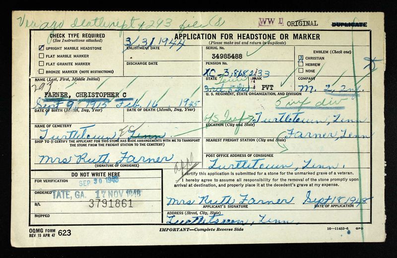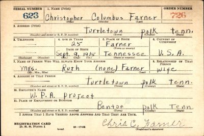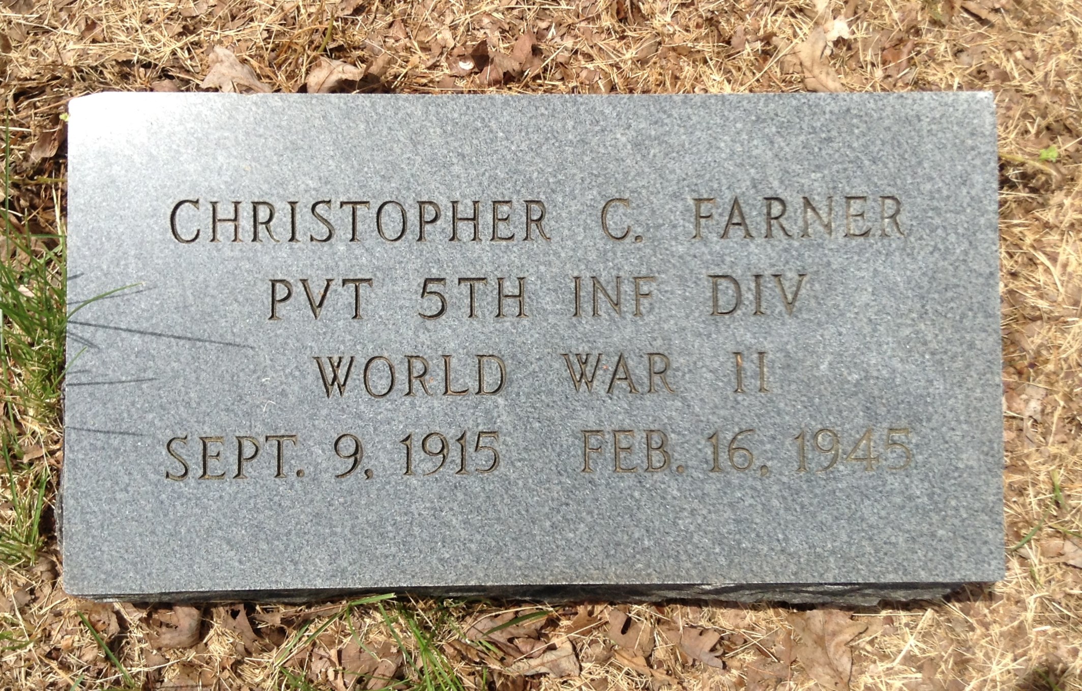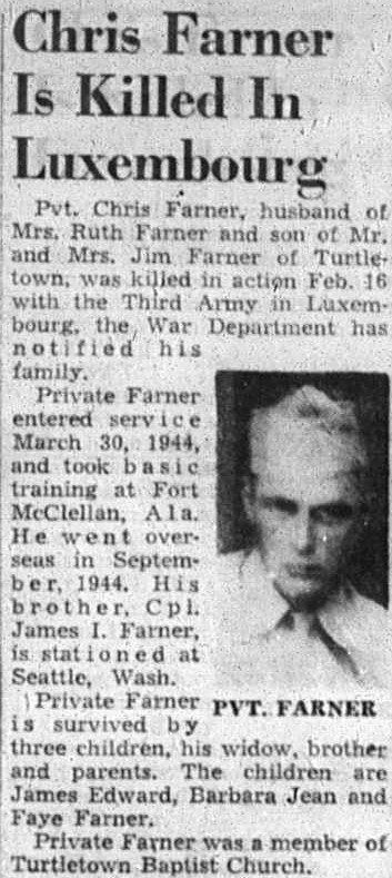 Pvt. Chris Farner, husband of Mrs. Ruth Farner and son of Mr. and Mrs. Jim Farner of Turtletown, was killed in action Feb. 16 with the Third Army in Luxembourg, the War Department has notified his family. Private Farner entered service March 30, 1944 and took basic training at Fort McClellan, Ala. He went overseas in September, 1944. His brother, Cpl. James I. Farner, is stationed at Seattle, Wash. Private Farner is survived by three childrren, his widow, brother and parents. The children are James Edward, Barbara Jean and Faye Farner. Private Farner was a member of Turtletown Baptist Church.
