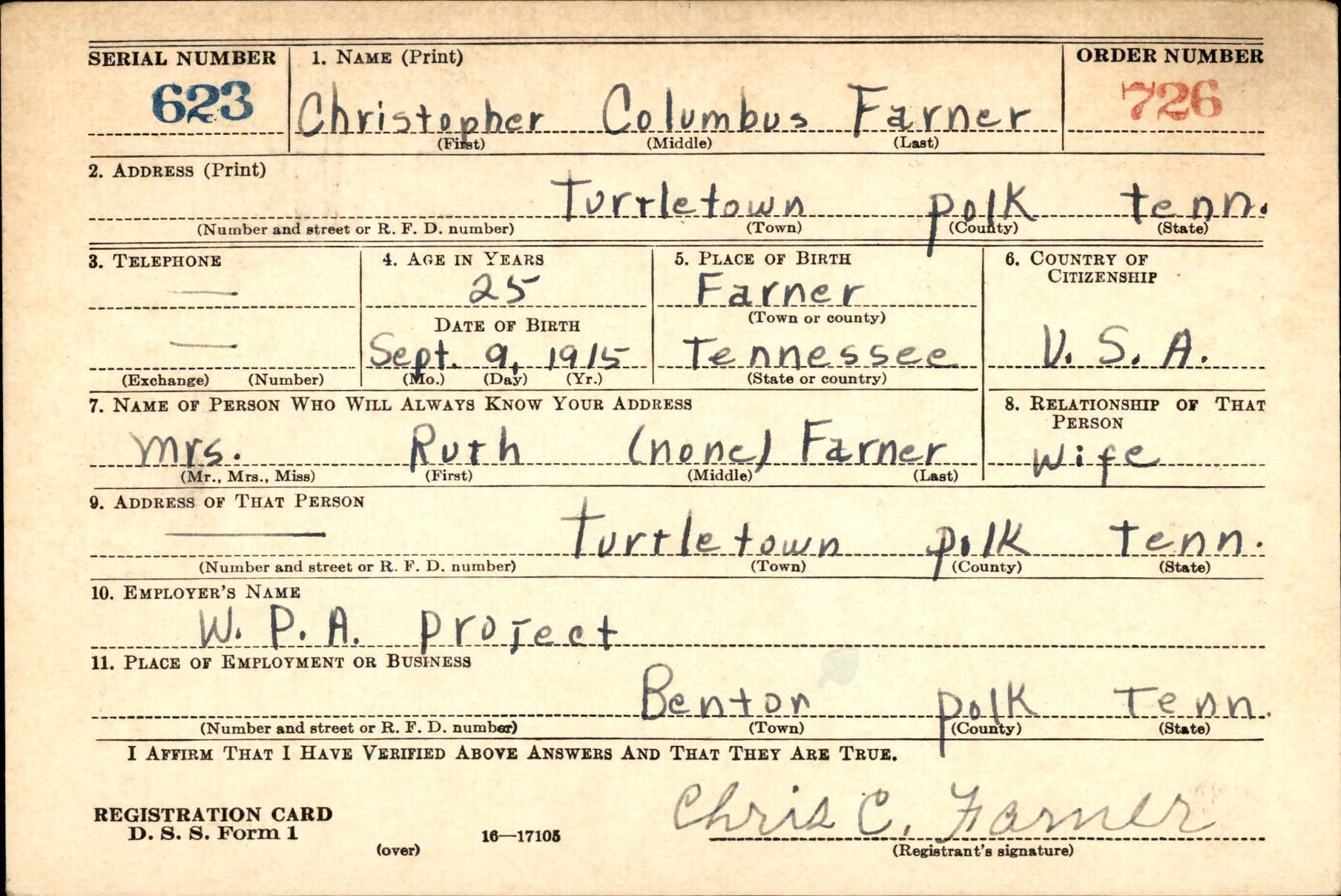 Christopher Columbus Farner was born on 9 September 1915. He was the son of James F. Farner and Gertrude Rogers. He was married to Alice Ruthran “Ruth” Evans and father of James Edward Farner and Barbara Jean Farner.